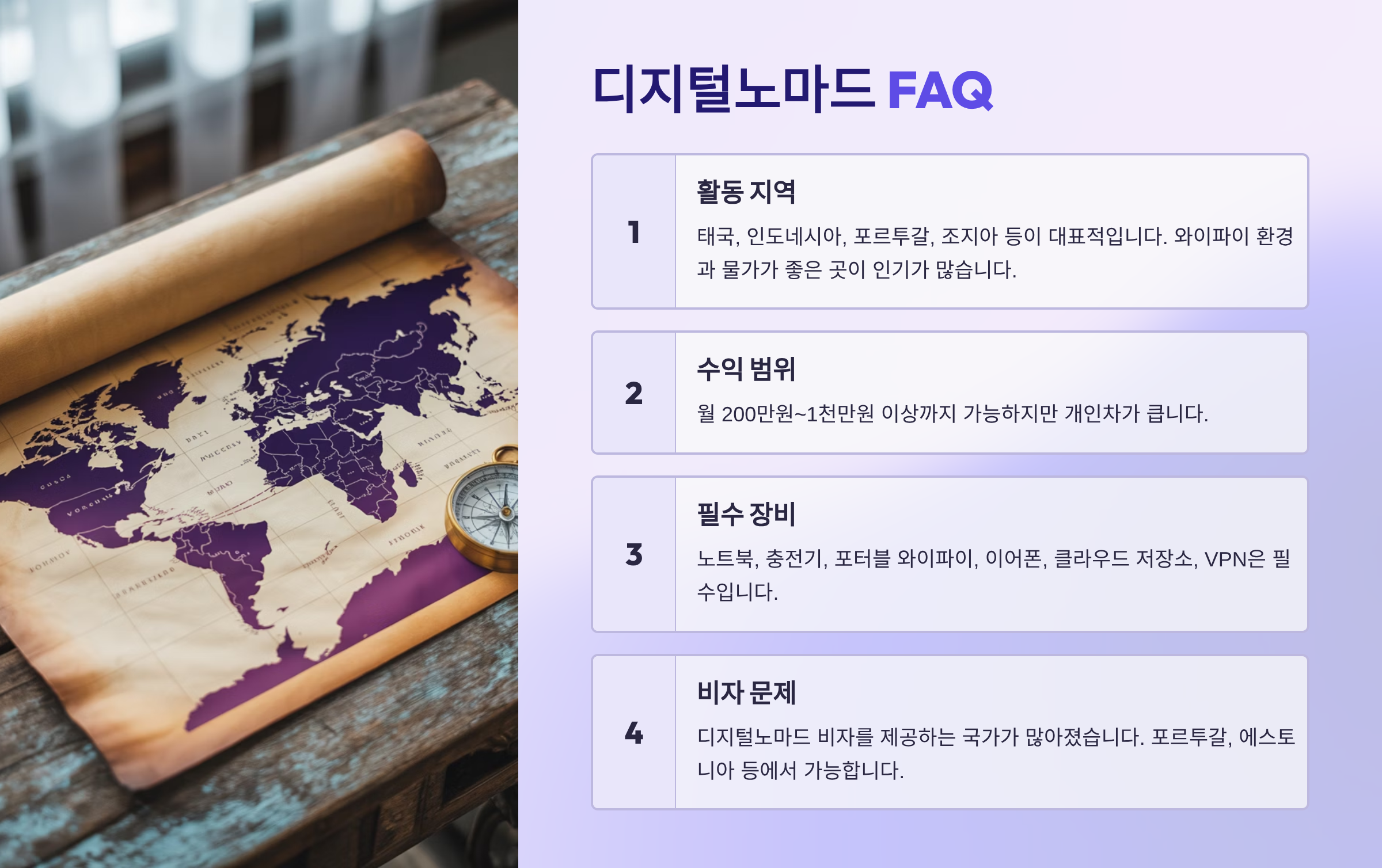 기후, 물가, 비자 조건을 고려해 결정하세요. 요즘은 카페 문화와 코워킹스페이스도 중요한 요소예요.