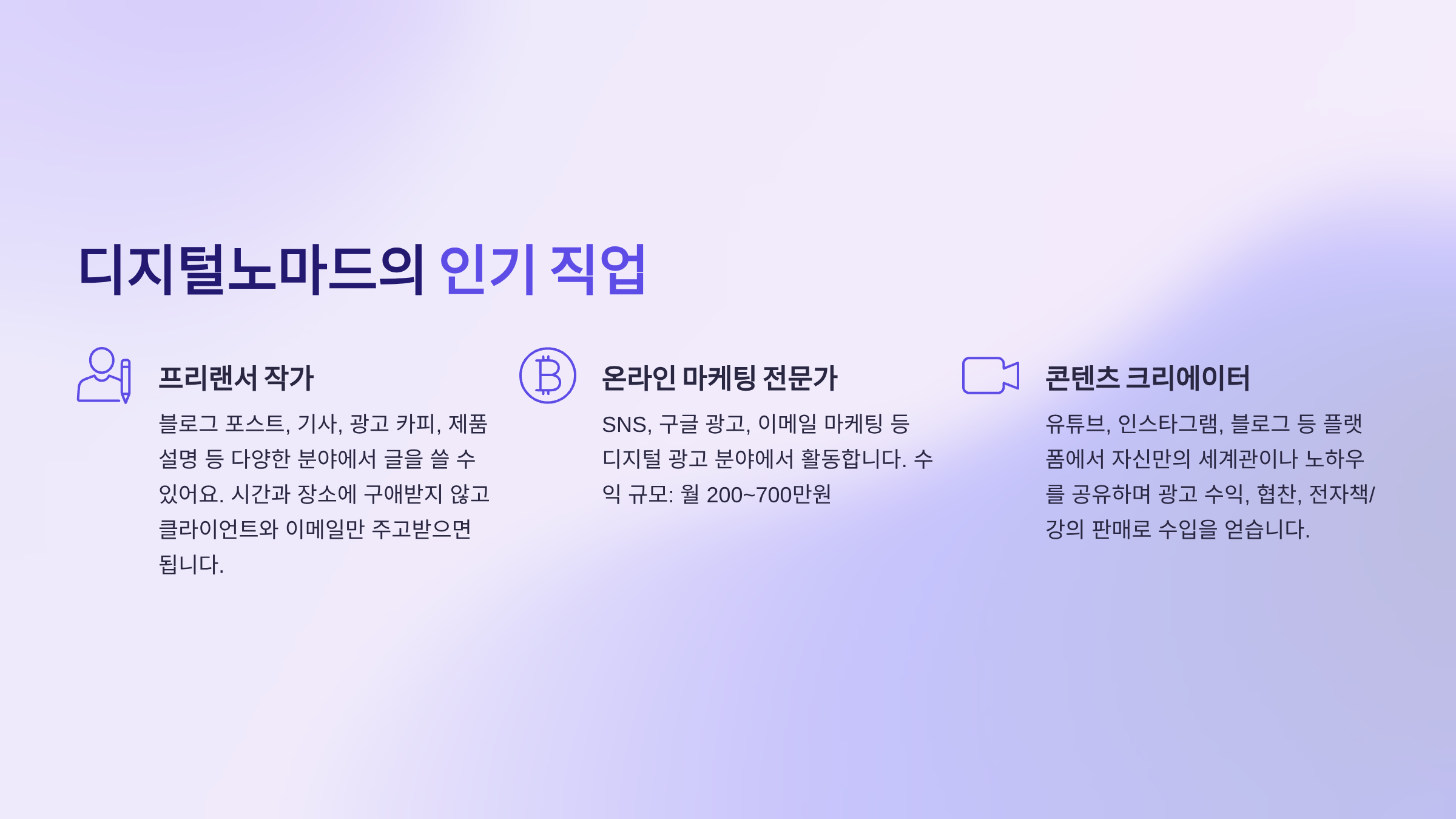 프리랜서 작가는 디지털노마드에게 가장 사랑받는 직업 중 하나예요. 시간과 장소에 구애받지 않고 클라이언트와 이메일만 주고받으면 되니까요. 블로그 포스트, 기사, 광고 카피, 제품 설명 등 다양한 분야에서 글을 쓸 수 있어요. 저도 처음에는 블로그 리뷰 글 몇 편으로 시작했는데, 지금은 해외 클라이언트와도 협업하고 있어요. 쓰는 능력은 갈수록 늘고, 수익도 점점 올라가니 이보다 더 좋을 수 있을까요?