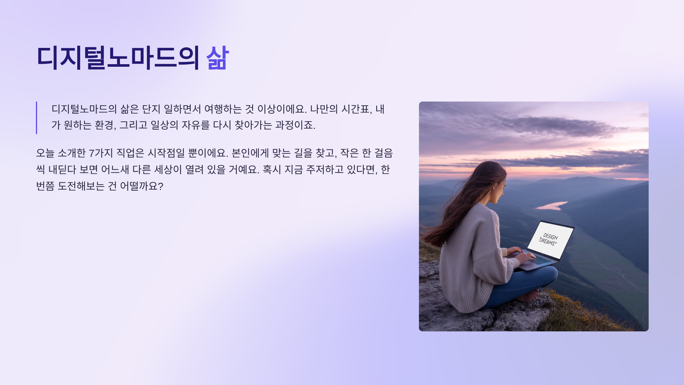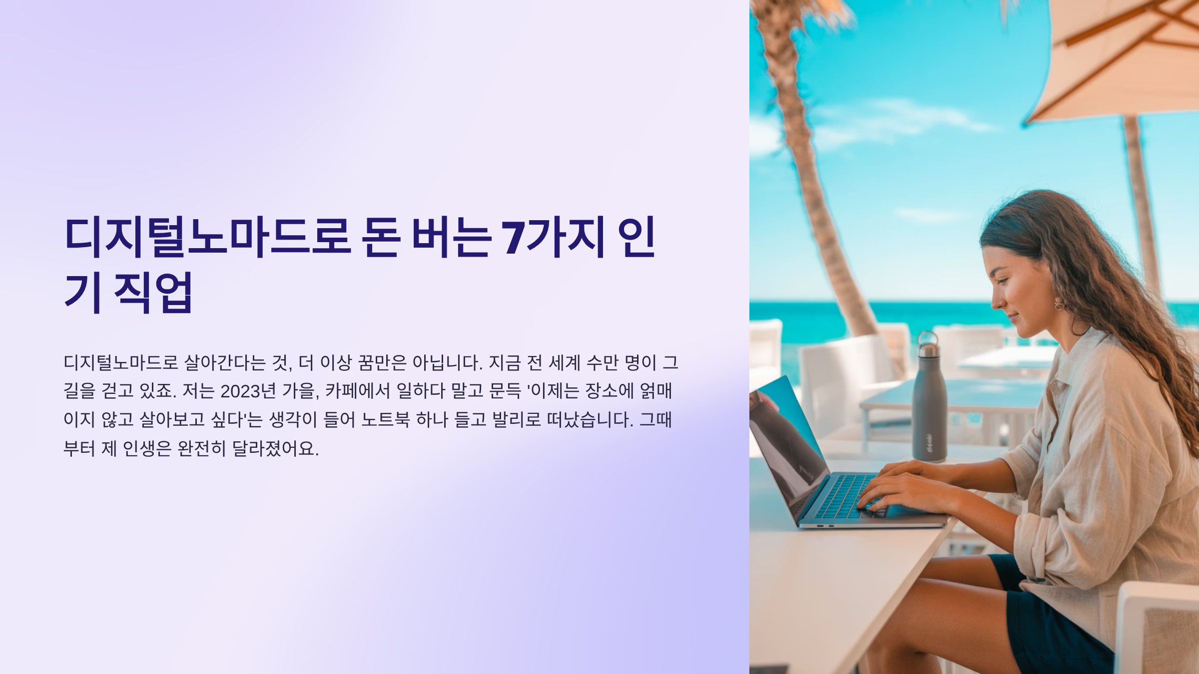 안녕하세요! 저는 2023년 가을, 카페에서 일하다 말고 문득 ‘이제는 장소에 얽매이지 않고 살아보고 싶다’는 생각이 들었어요. 그렇게 노트북 하나 들고 첫 여행지였던 발리로 떠났죠. 그때부터 제 인생은 완전히 달라졌습니다. 숙소에서, 바닷가에서, 때로는 산속 와이파이 약한 카페에서 일하면서도 수익은 점점 늘었거든요. 그래서 오늘은 여러분께 디지털노마드로 실제 돈을 벌 수 있는 직업 7가지를 소개해보려 해요. 저처럼 새로운 삶을 원하시는 분들께 작은 영감이 되었으면 좋겠어요.