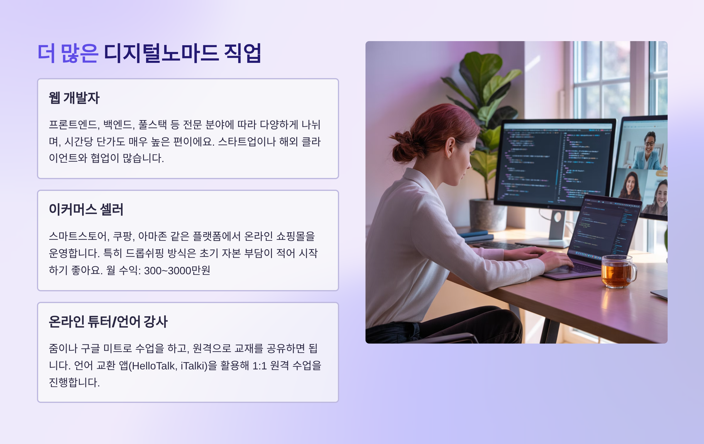 고정 수입보다 더 중요한 건 자기관리 능력과 인터넷만 있으면 일할 수 있는 직무를 갖고 있는 거예요.