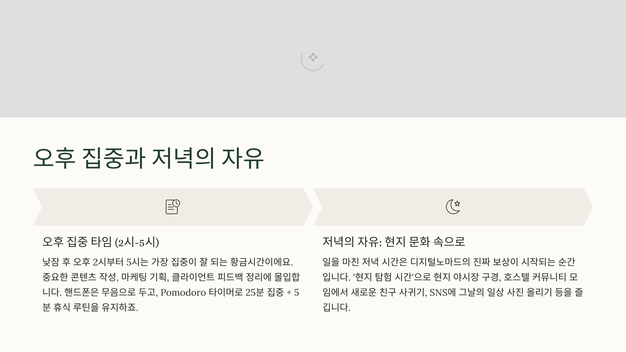 12시가 조금 넘으면 노트북을 닫고, 현지 식당이나 로컬 푸드 마켓을 찾아 나섭니다. 저의 베스트 루틴 중 하나는 맛있는 점심 + 짧은 산책 + 20분 낮잠입니다. 특히 낮잠은 필수예요. 오후 집중력을 두 배로 끌어올려주거든요. 처음엔 낮잠 자는 게 게으른 습관 같았는데, 이젠 생산성 도구처럼 활용하고 있어요.
