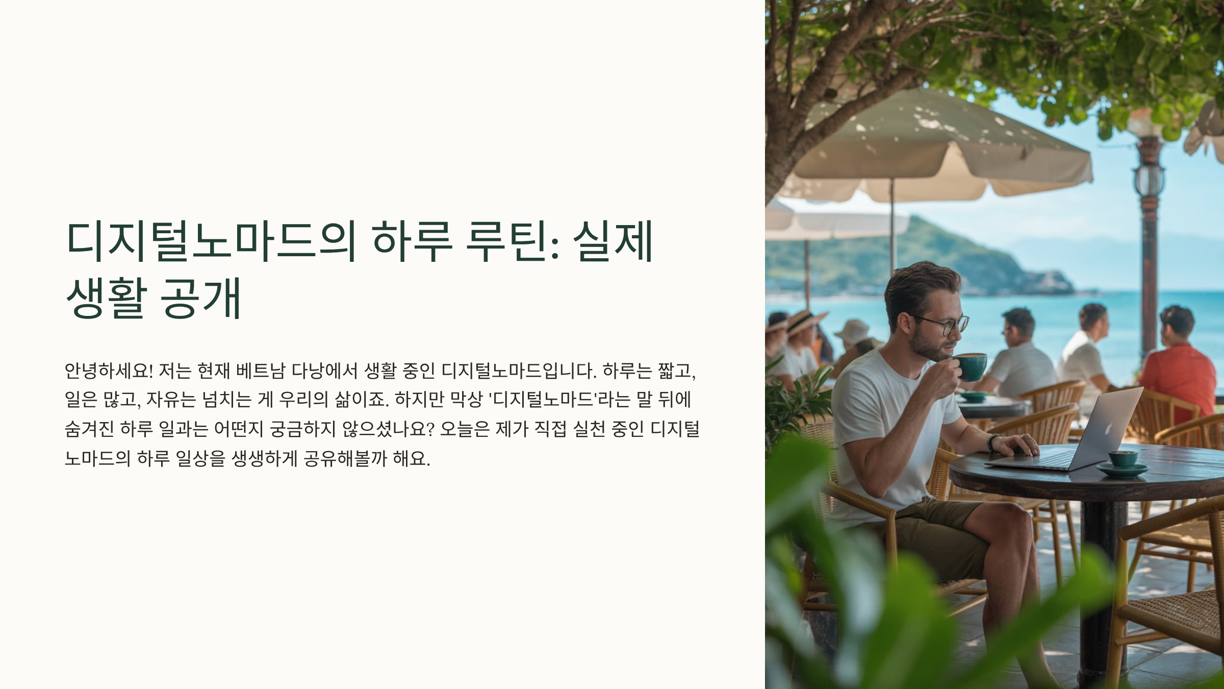 안녕하세요! 저는 현재 베트남 다낭에서 생활 중인 디지털노마드입니다. 하루는 짧고, 일은 많고, 자유는 넘치는 게 우리의 삶이죠. 하지만 막상 ‘디지털노마드’라는 말 뒤에 숨겨진 하루 일과는 어떤지 궁금하지 않으셨나요? 저도 처음엔 막연한 낭만만 기대했었어요. 지금은 루틴이 없으면 오히려 더 피곤해지더라구요. 그래서 오늘은 제가 직접 실천 중인 디지털노마드의 하루 일상을 생생하게 공유해볼까 해요. 커피 한 잔 옆에 두고, 편하게 읽어주세요 :)
