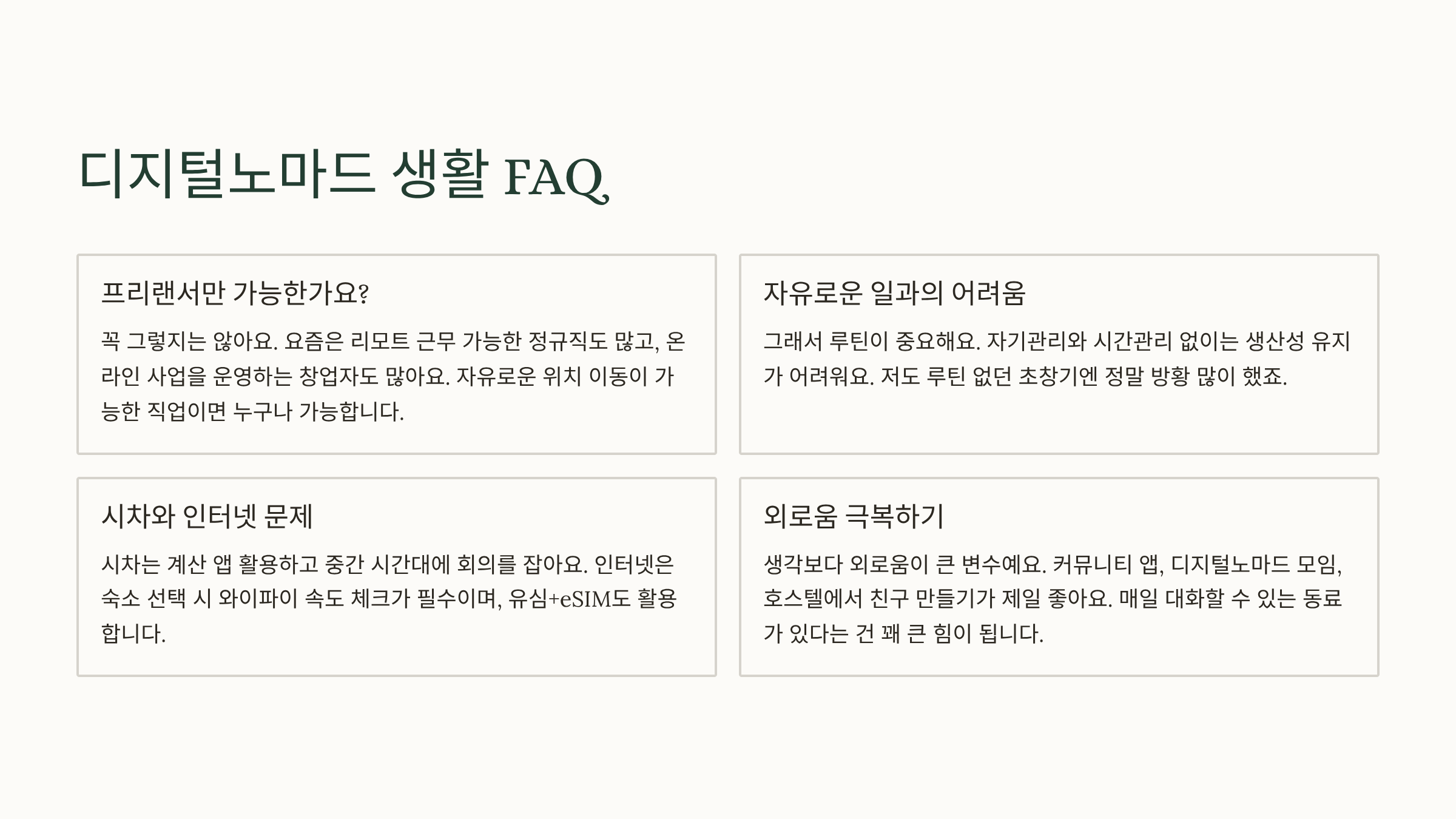 생각보다 외로움이 큰 변수예요. 커뮤니티 앱, 디지털노마드 모임, 호스텔에서 친구 만들기가 제일 좋아요. 매일 대화할 수 있는 동료가 있다는 건 꽤 큰 힘이 됩니다.