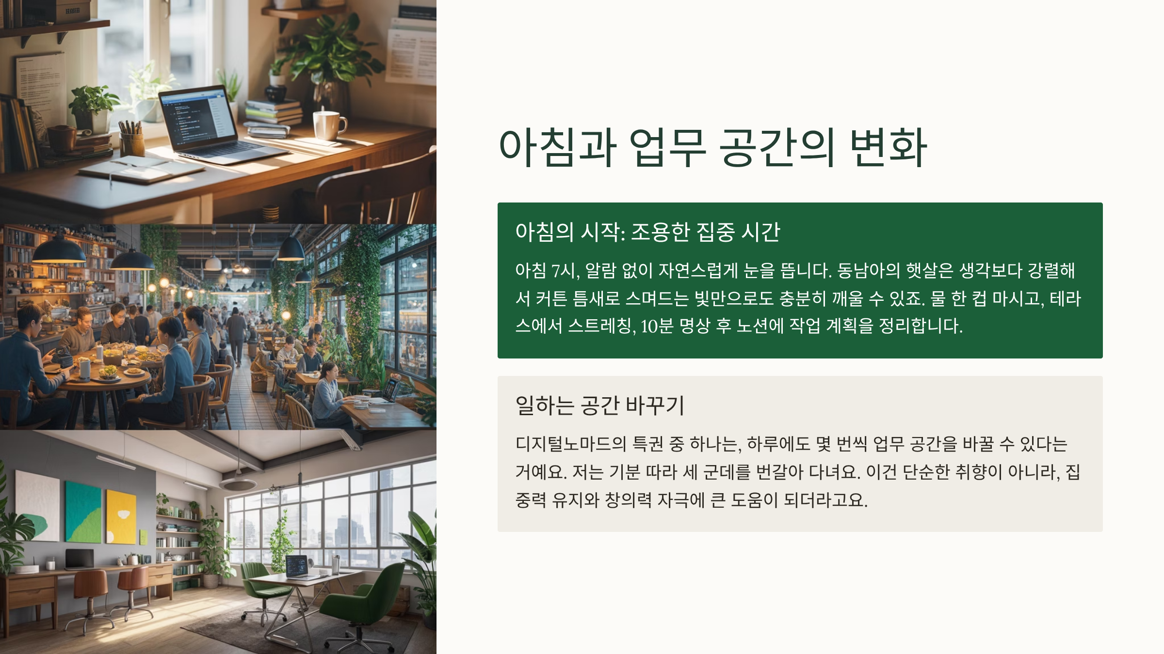 디지털노마드의 특권 중 하나는, 하루에도 몇 번씩 업무 공간을 바꿀 수 있다는 거예요. 저는 기분 따라 세 군데를 번갈아 다녀요. 이건 단순한 취향이 아니라, 집중력 유지와 창의력 자극에 큰 도움이 되더라고요.