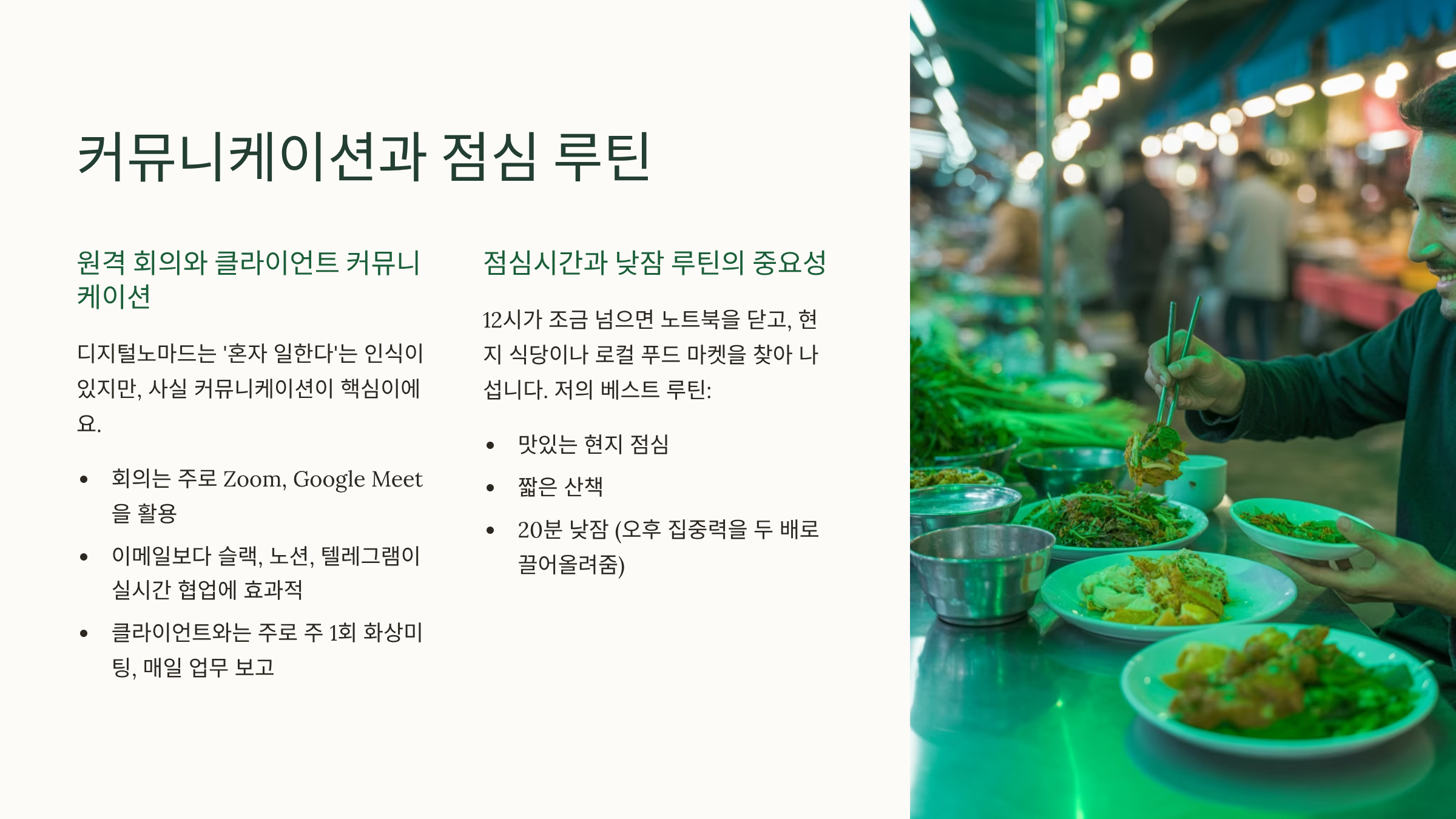 디지털노마드는 '혼자 일한다'는 인식이 있지만, 사실 커뮤니케이션이 핵심이에요. 프로젝트마다 다양한 클라이언트와 협업하고, 시차 조절도 일상입니다.