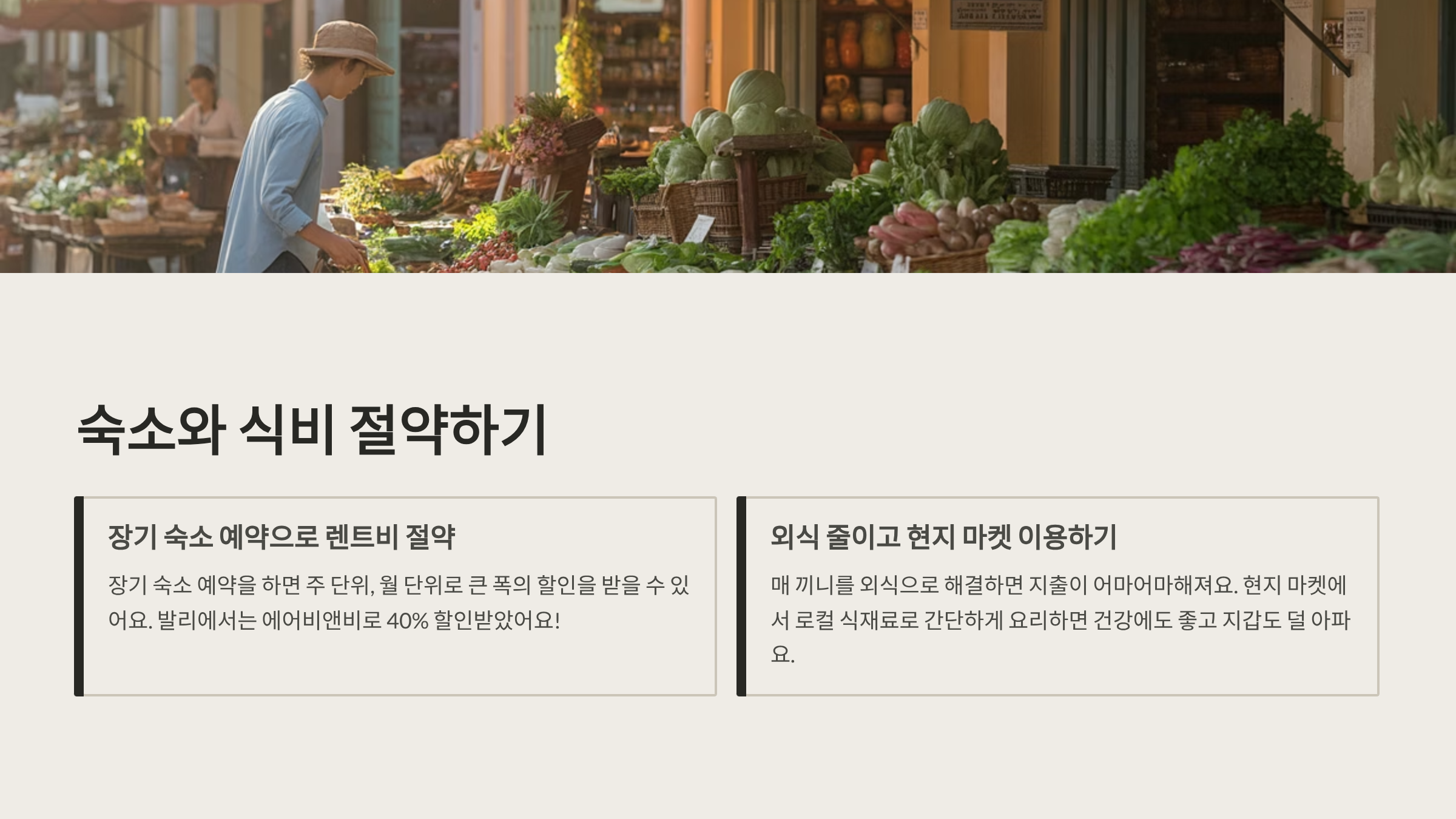 짧은 여행이라면 하루하루 지불하는 숙박비도 괜찮겠지만, 디지털노마드는 이야기가 달라요. 장기 숙소 예약을 하면 주 단위, 월 단위로 큰 폭의 할인을 받을 수 있어요. 예전에 발리에 한 달 살아보기 했을 때, 에어비앤비에서 40% 할인받았던 기억이 나네요. 혹시나 해서 하루만 예약하고 현지에서 직접 협상해본 적도 있는데, 의외로 통하는 곳이 꽤 많더라고요!