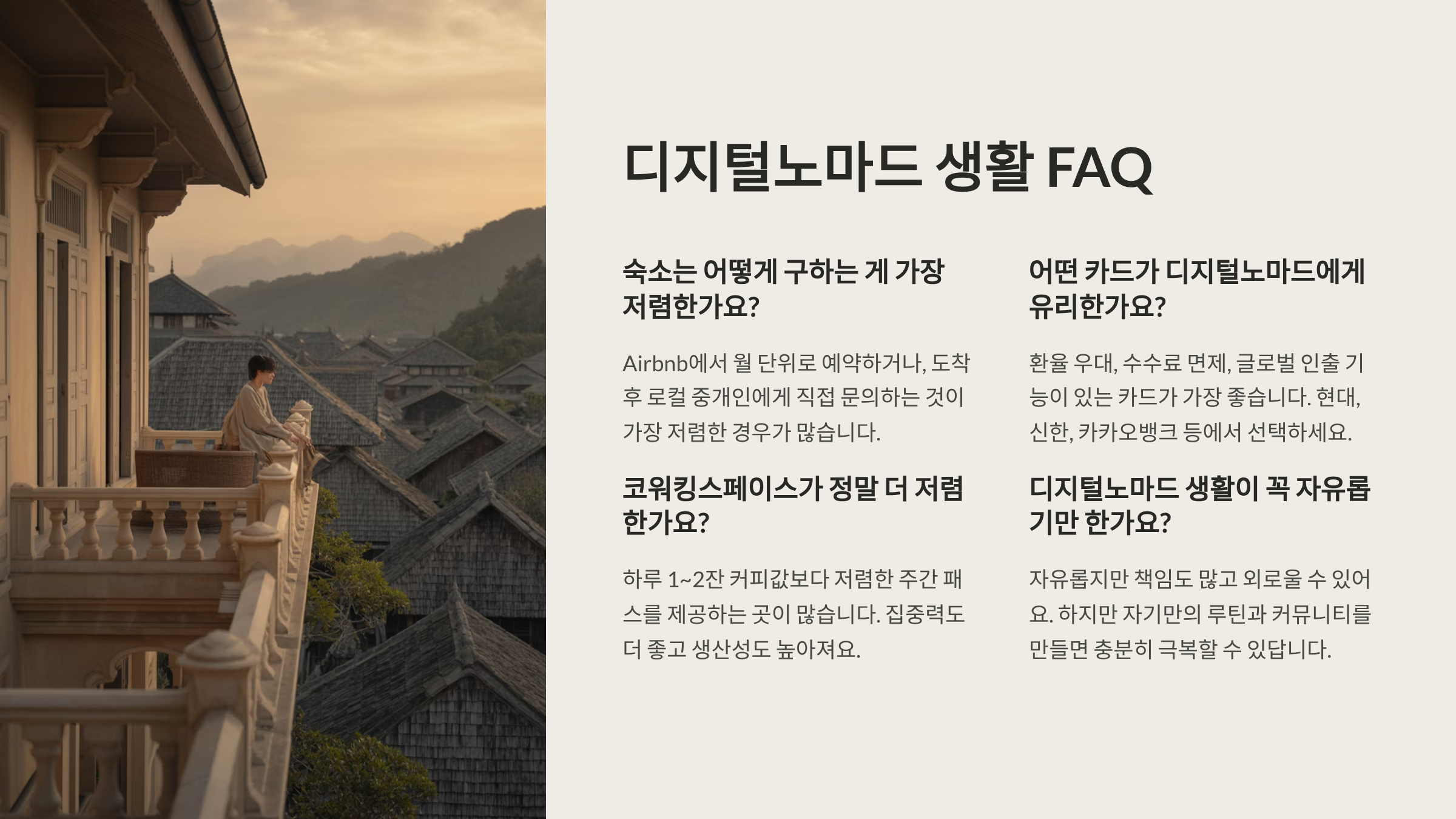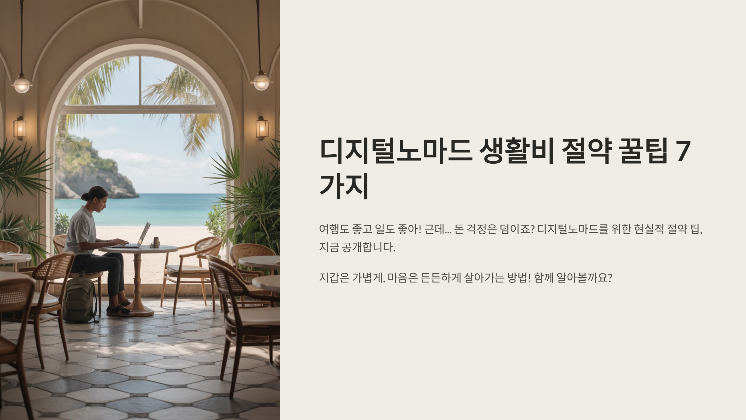 안녕하세요 여러분! 저는 지금 동남아의 한 조용한 마을에서 이 블로그 글을 쓰고 있어요. 와이파이만 있으면 어디서든 일할 수 있는 삶, 디지털노마드로서의 삶은 정말 자유롭고 멋지죠. 하지만 솔직히 말하면 생활비 관리가 생각보다 어렵더라고요. 매번 다른 도시, 다른 나라에서 지내다 보니 예산 세우는 게 쉽지 않았거든요. 그래서 오늘은 제가 직접 겪으면서 터득한 디지털노마드 생활비 절약 꿀팁 7가지를 공유하려고 해요. 지갑은 가볍게, 마음은 든든하게 살아가는 방법! 함께 알아볼까요?