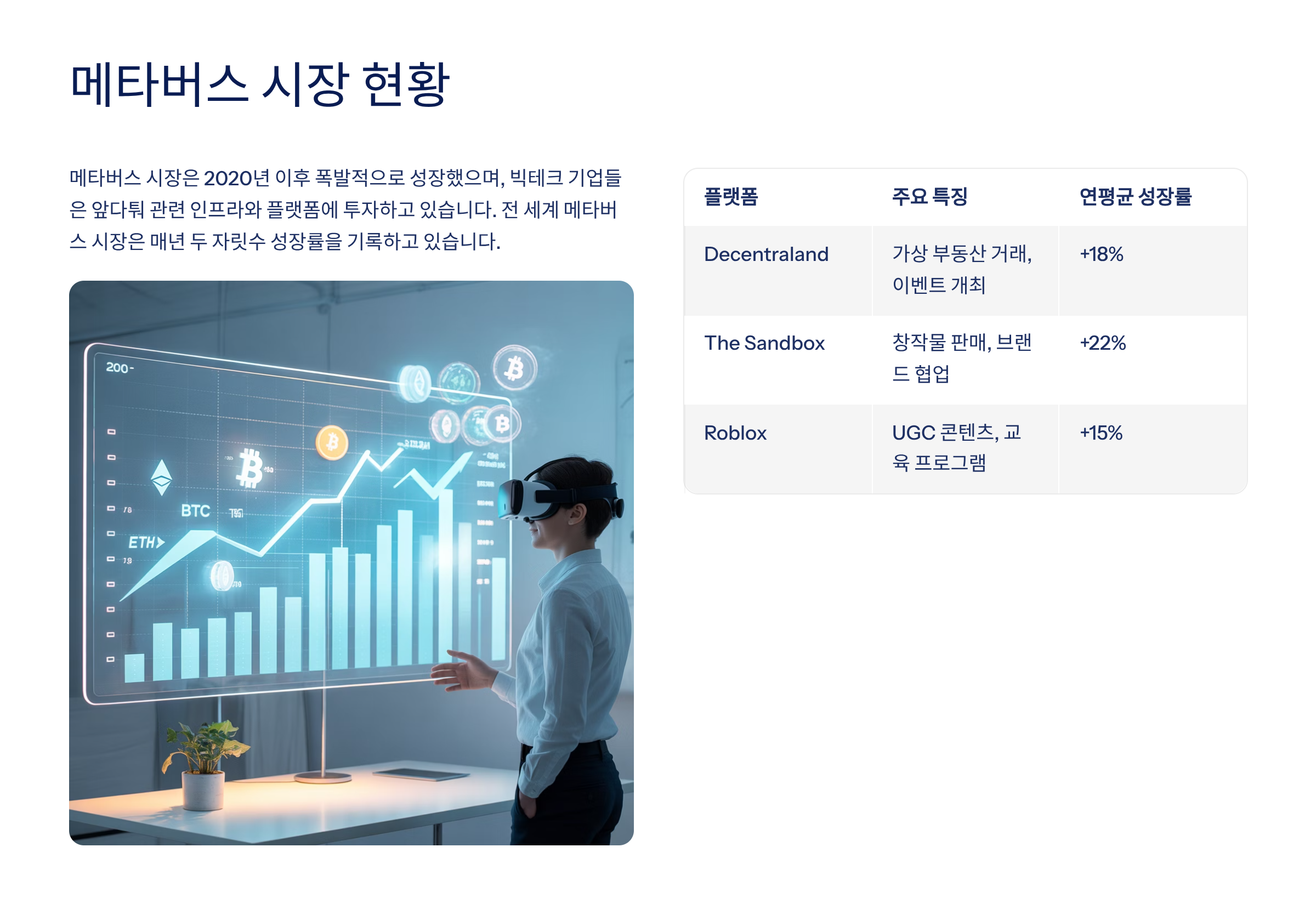 메타버스 시장은 2020년 이후 폭발적으로 성장했습니다. 빅테크 기업들은 앞다퉈 메타버스 관련 인프라와 플랫폼에 투자하고 있으며, 전 세계 메타버스 시장 규모는 매년 두 자릿수 성장률을 기록하고 있습니다. 아래 표는 최근 주요 플랫폼과 성장률을 정리한 것입니다.