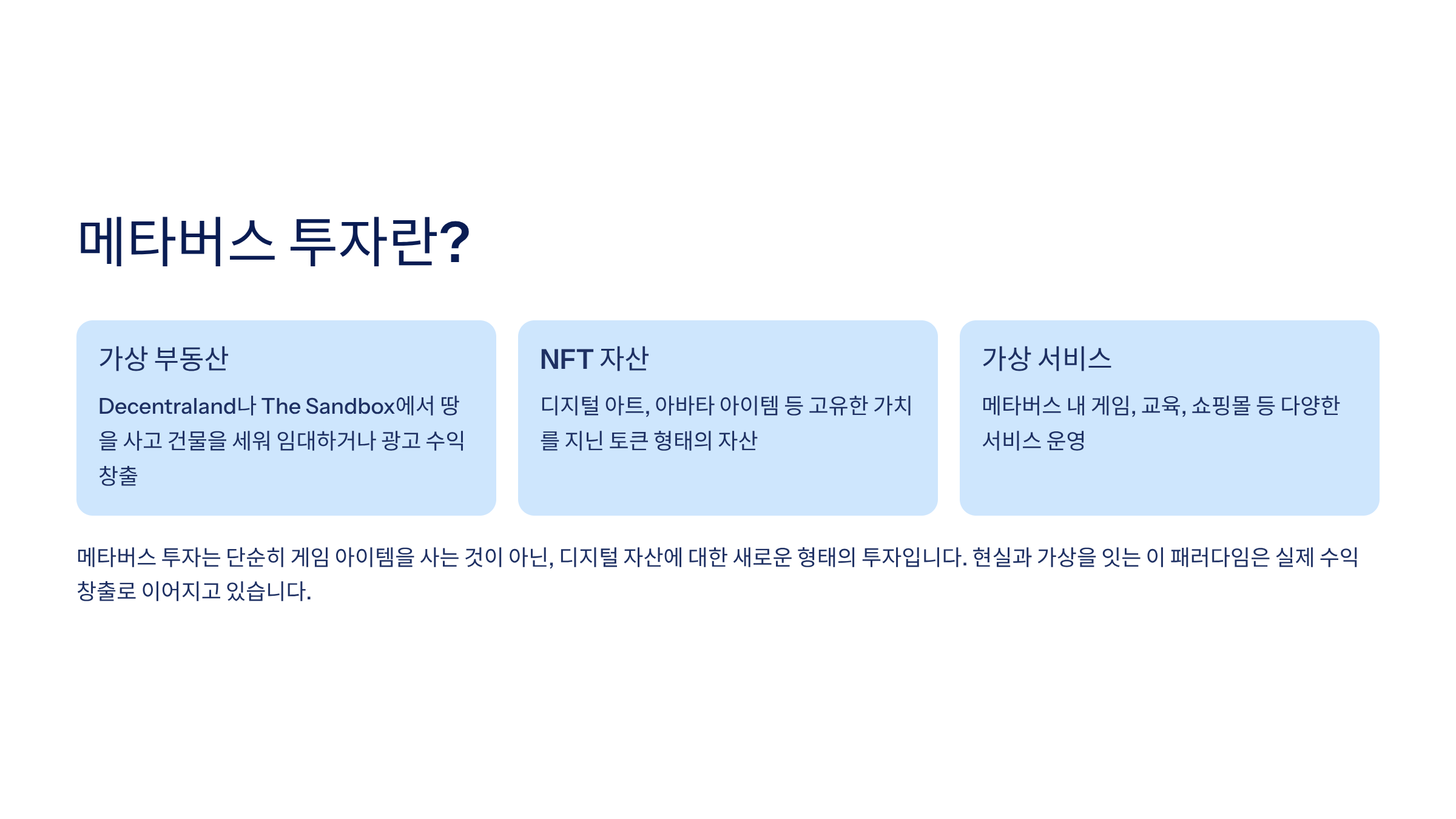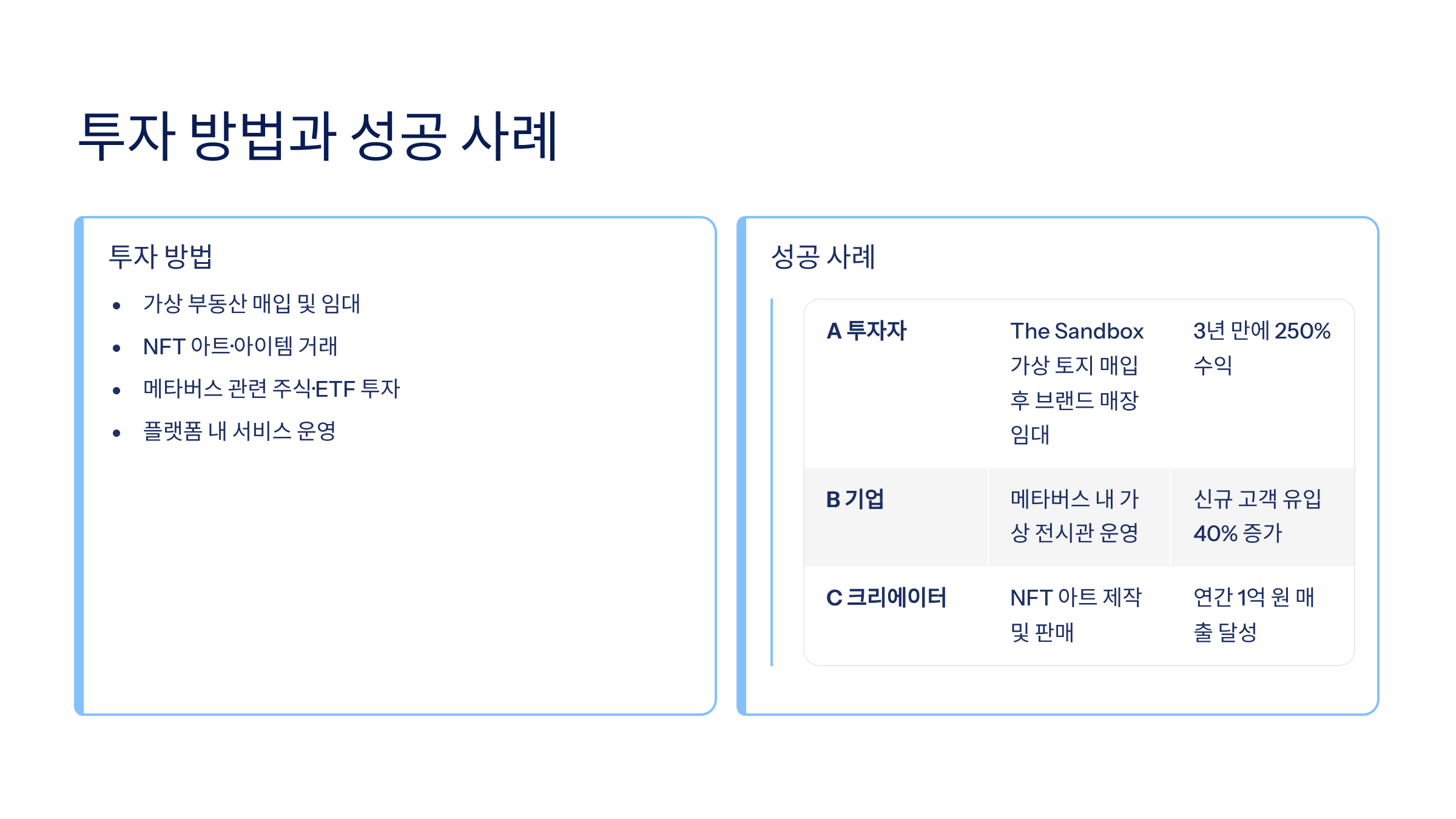 | A 투자자 | The Sandbox 가상 토지 매입 후 브랜드 매장 임대 | 3년 만에 250% 수익 |