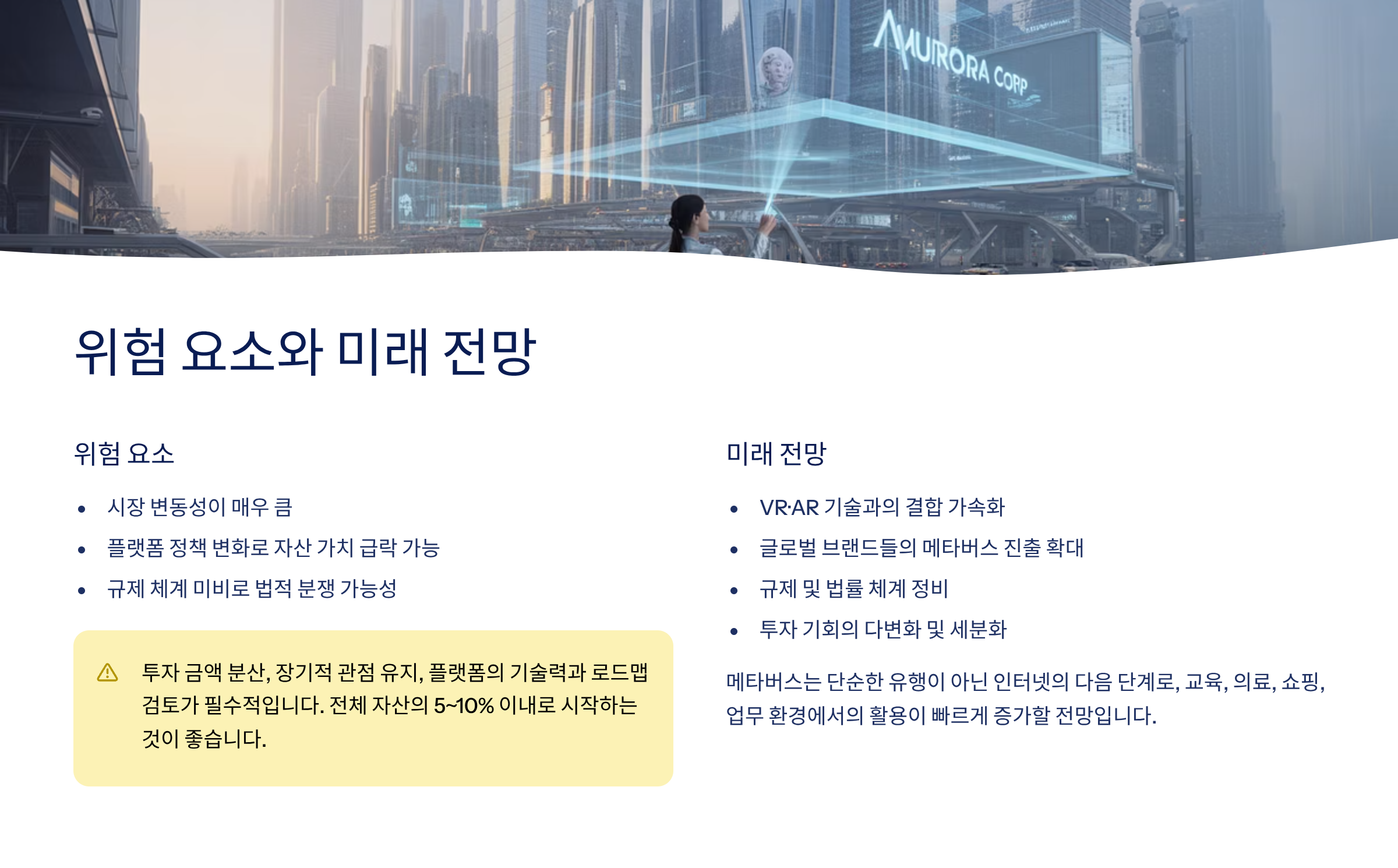 메타버스 투자는 잠재력만큼이나 위험 요소도 큽니다. 시장 변동성이 심하고, 특정 플랫폼의 정책 변화나 기술적 문제로 인해 자산 가치가 급락할 수 있습니다. 또한 아직 규제 체계가 명확하지 않아 법적 분쟁 가능성도 존재합니다.