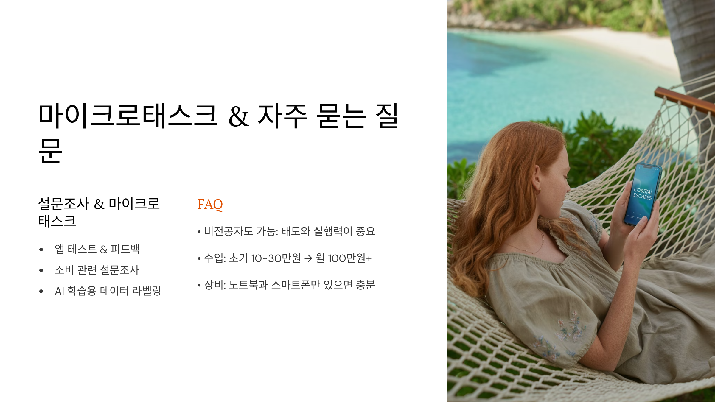 돈 되는 잔심부름, 해보신 적 있으세요? 😂 마이크로태스크는 1~10분 정도 걸리는 아주 간단한 일을 처리하는 작업이에요. 예를 들어 "이 사진에 고양이가 몇 마리 있나요?" 같은 질문에 답하거나, 앱 테스트를 하고 피드백을 작성하는 식이죠. 시간 단위가 아니라 ‘단건 기준’ 수익이라 틈새 시간 활용에 좋아요.
