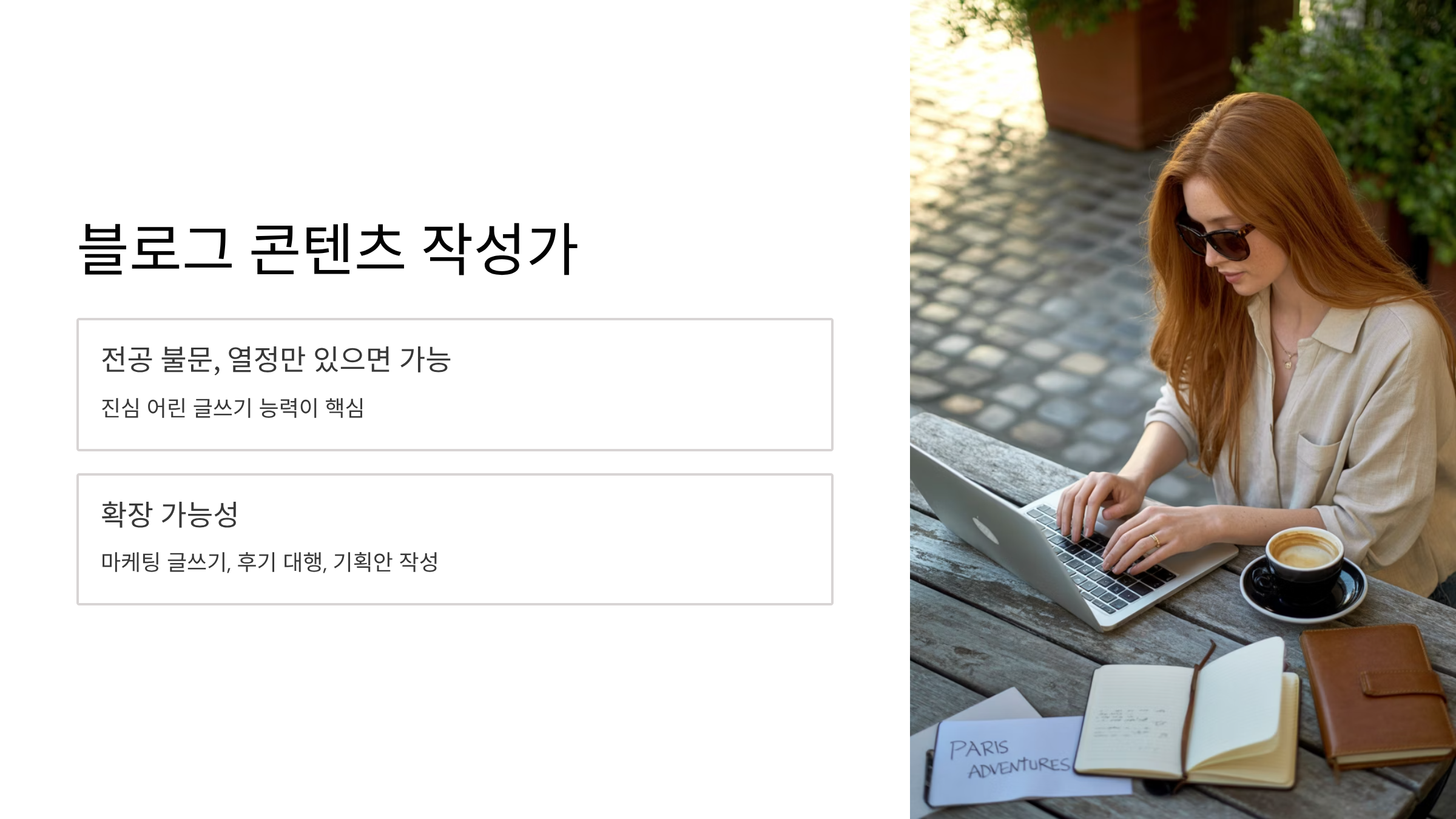 요즘 온라인에 콘텐츠는 넘쳐나지만, 진짜 사람 냄새 나는 글은 귀하죠. 블로그 콘텐츠 작성은 전공 불문! 중요한 건 글을 진심으로 써내려갈 수 있는 열정이에요. 여행 중에도, 집 앞 카페에서도 키보드만 있다면 어디서든 일할 수 있죠. 저도 처음엔 ‘일기 쓰듯’ 시작했다가 지금은 제 글이 수익으로 이어지고 있어요. 블로그 포스팅 외에도 마케팅 글쓰기, 후기 대행, 기획안 작성 등 다양하게 확장 가능하답니다.