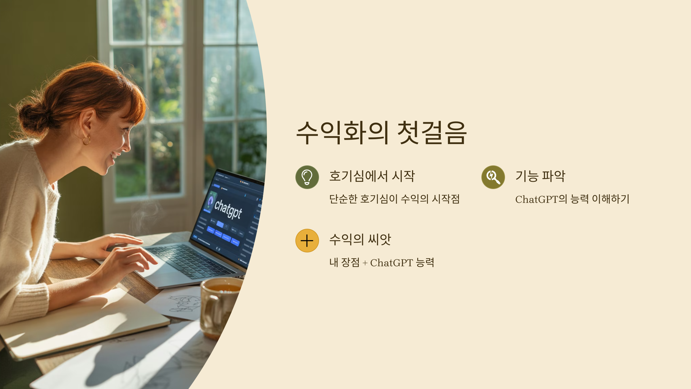 수익화의 시작은 단순한 ‘호기심’에서 출발합니다. ChatGPT를 처음 써봤을 때, 저도 그냥 장난처럼 글을 써보고, 퀴즈를 만들어보고, 여행 일정도 짜봤죠. 그런데 주변에서 “이거 진짜 쓸만하다”는 반응이 쏟아지자 문득 깨달았어요. 이거, 콘텐츠 서비스로 돈을 벌 수 있겠구나! 그래서 제일 먼저 한 일은 ChatGPT의 기능을 파악하는 것이었고, 그 다음은 ‘내가 잘할 수 있는 방식’으로 연결하는 작업이었어요. 포인트는 이것입니다. 내가 가진 장점 + ChatGPT의 능력 = 수익의 씨앗