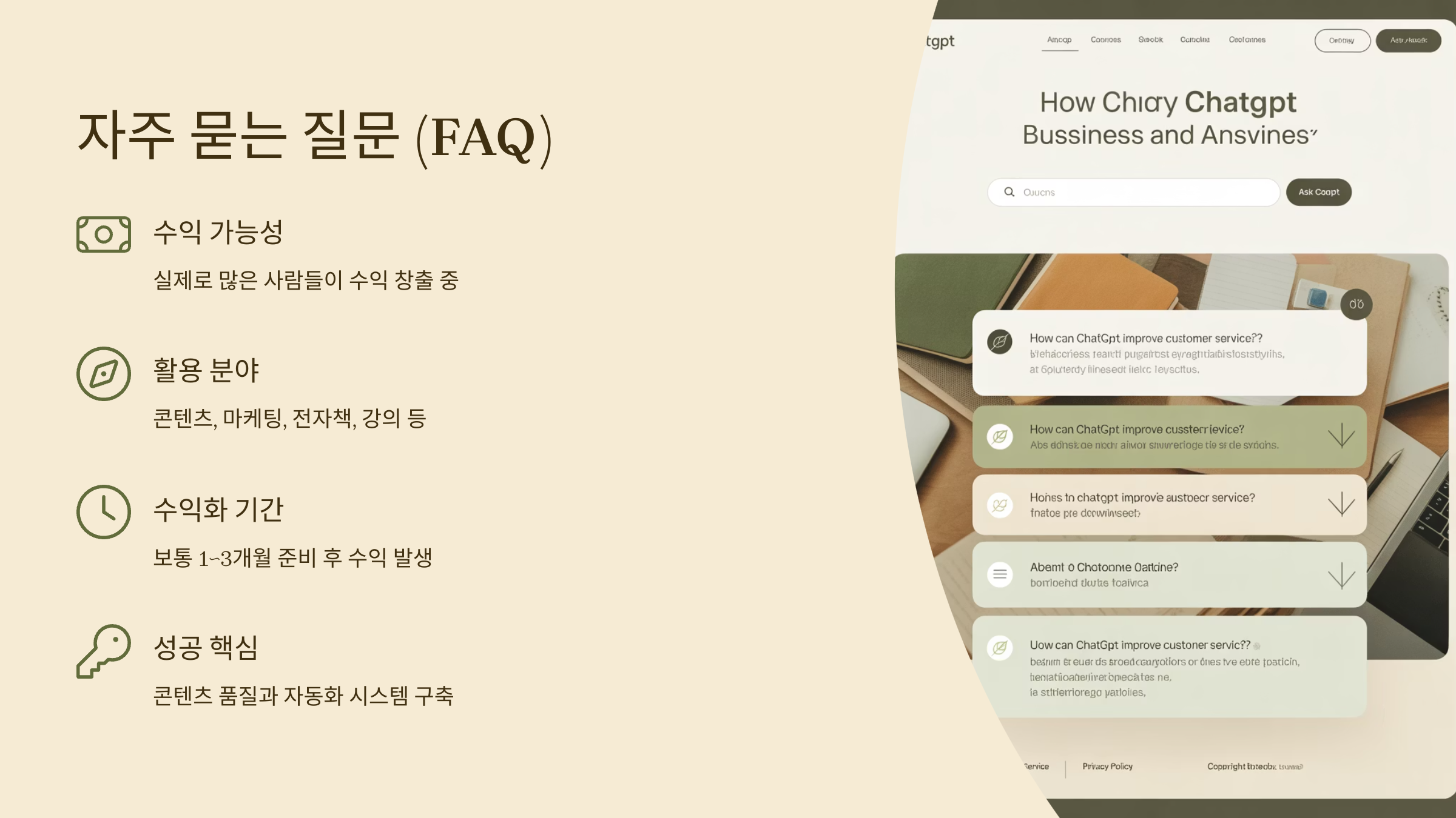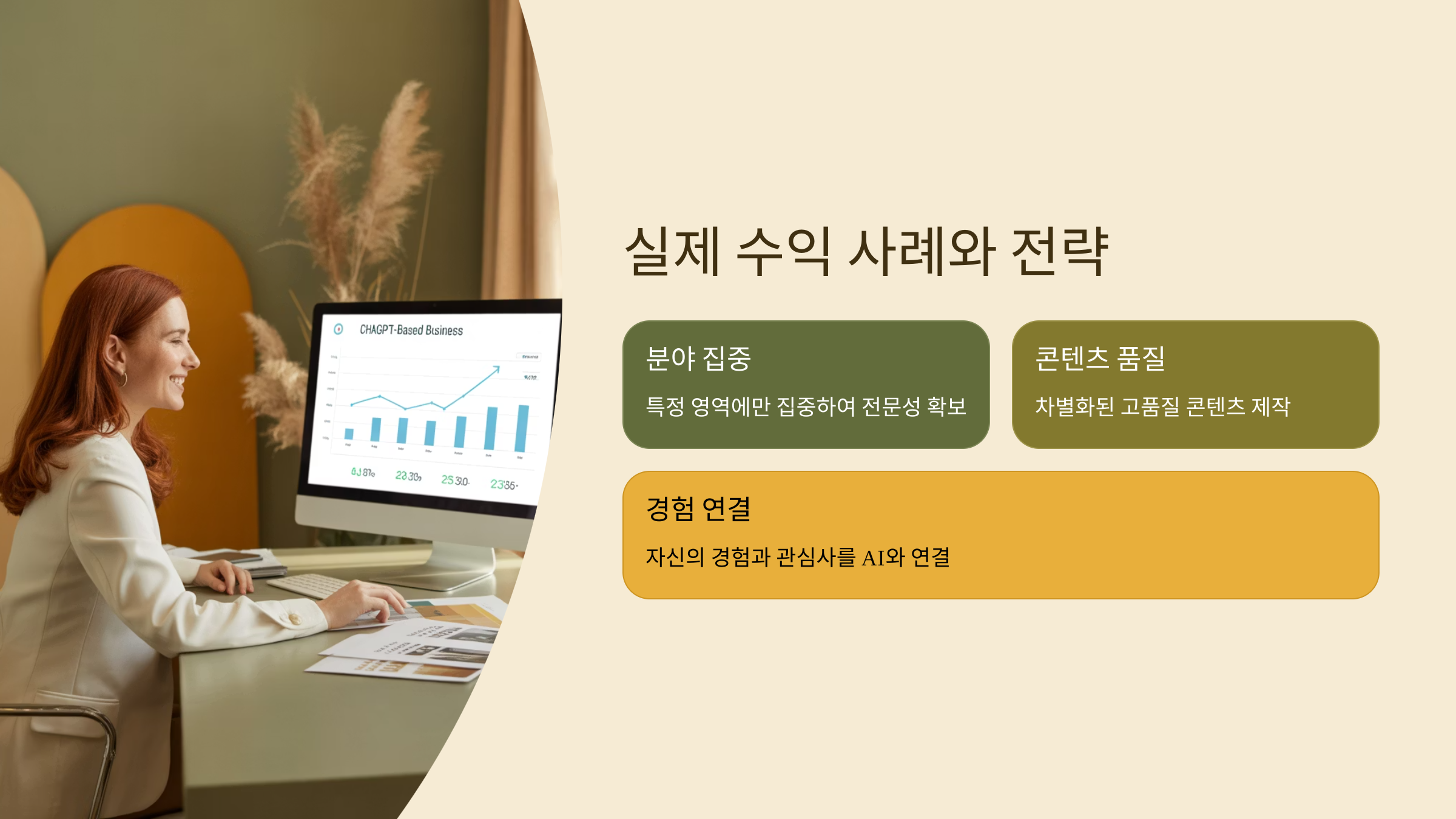 입니다. 예를 들어, 인스타그램 캡션 전문 ChatGPT 서비스를 만들어 월 수익 300만 원을 달성한 A씨는 오직 ‘소셜 글쓰기’에만 집중했어요. 또 다른 B씨는 ‘수험생을 위한 요약 콘텐츠’를 ChatGPT로 제작해 전자책을 출간하고, 스토어팜에서 베스트셀러까지 등극했죠. 중요한 건 뻔한 수익모델을 그대로 따라 하는 게 아니라, 자신의 경험과 관심사를 어떻게 AI와 연결하느냐예요.