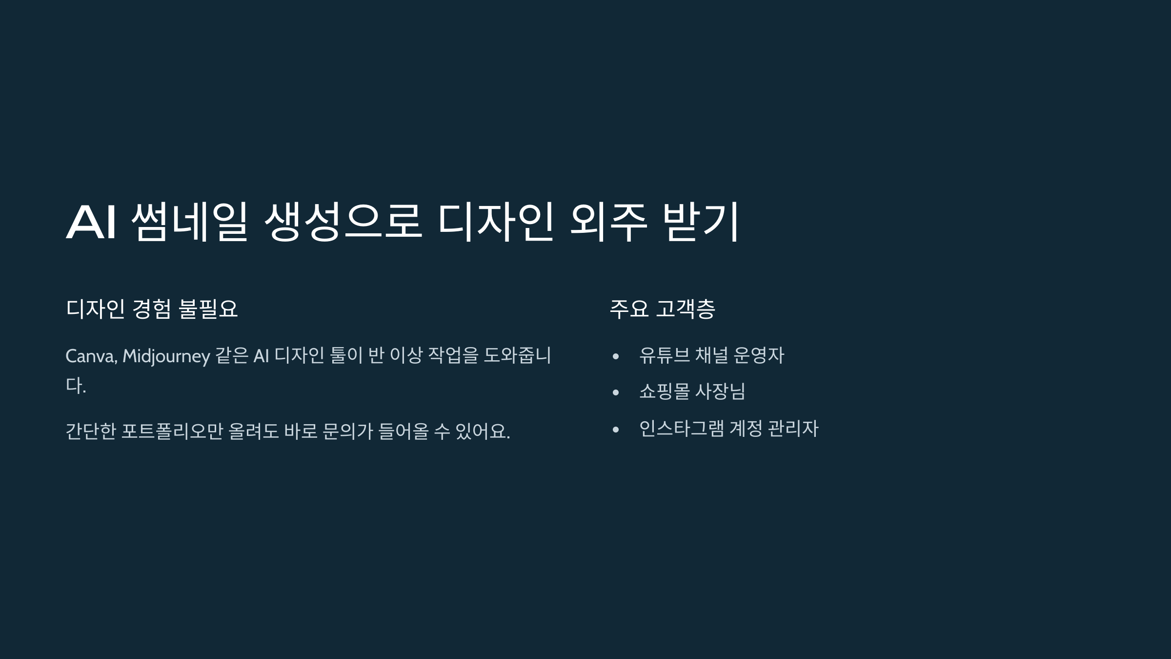 디자인, 해본 적 없는데요? 라고요? 괜찮아요. 지금은 Canva, Midjourney 같은 AI 디자인 툴이 거의 반 이상 작업을 도와주니까요. 유튜브 채널 운영자, 쇼핑몰 사장님, 인스타그램 계정 관리자 등 썸네일이나 배너 디자인을 필요로 하는 분들이 정말 많아요. 외주 플랫폼에서 간단한 포트폴리오만 올려도 바로 문의가 들어올 수 있어요.