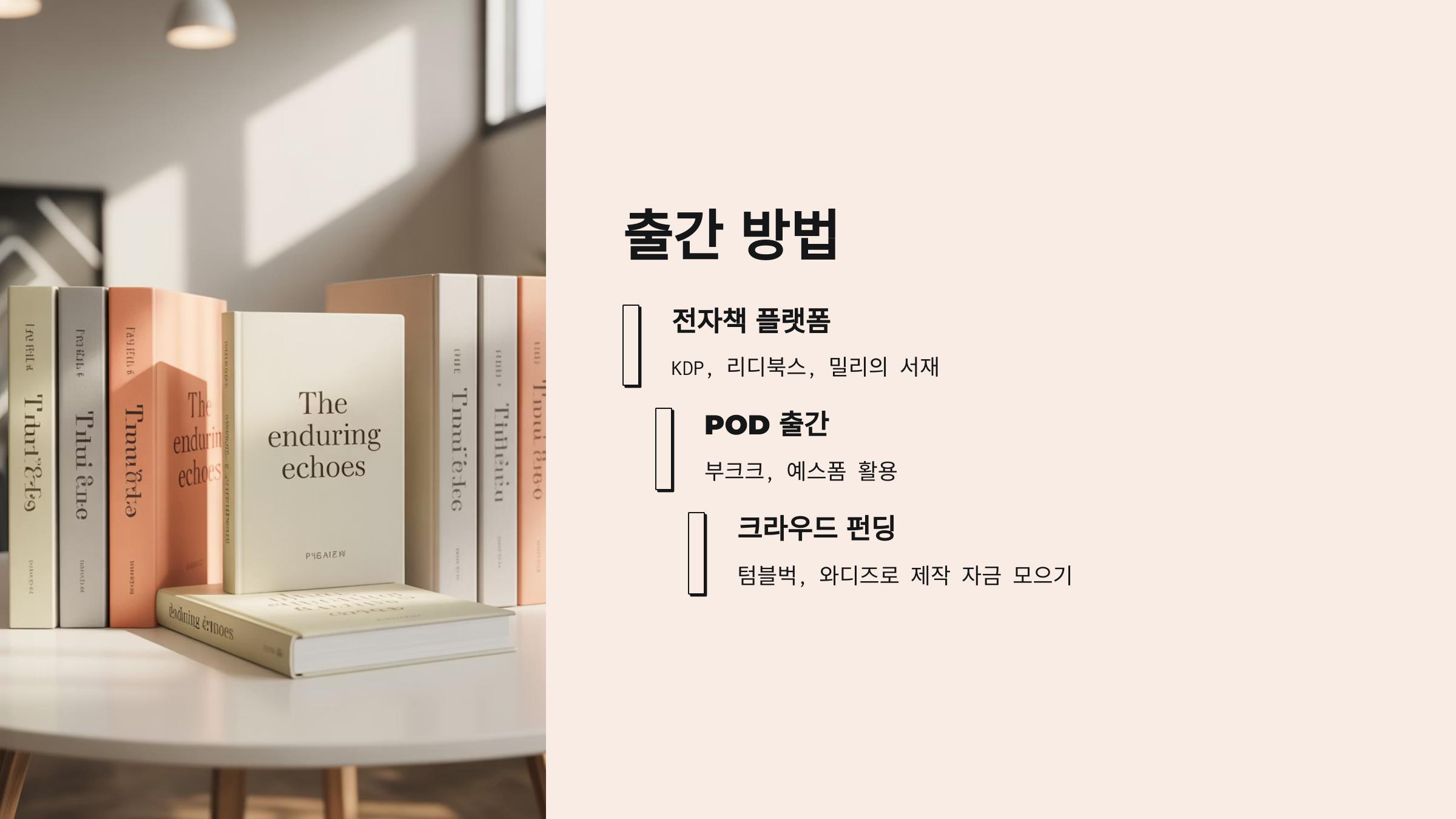 책을 다 썼으면 이제는 출간이죠. 요즘은 출판사 안 거쳐도 출판할 수 있는 시대예요. 아래 방법 중 하나를 선택해 보세요.