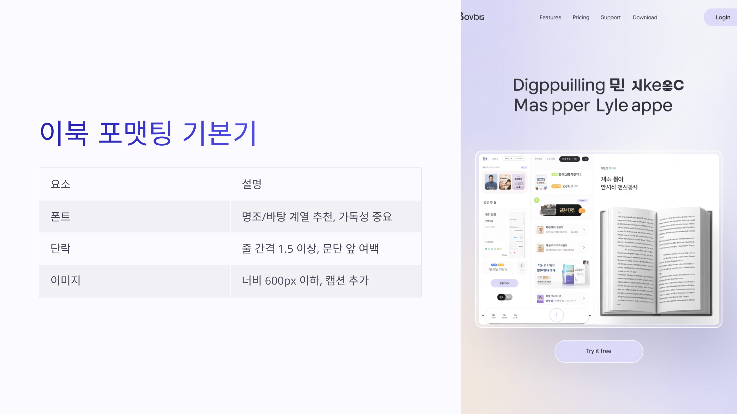 전자책은 보기 좋은 구성도 중요해요. 단락 간격, 글꼴, 헤딩, 이미지 위치까지... 정돈된 포맷은 독자의 신뢰를 얻습니다. 기본 포맷팅은 아래 표처럼 준비하면 됩니다.