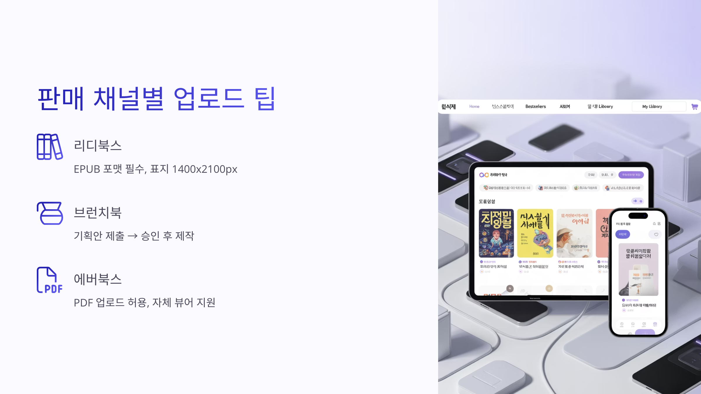 - 리디북스: EPUB 포맷 필수, 표지 1400x2100px 권장