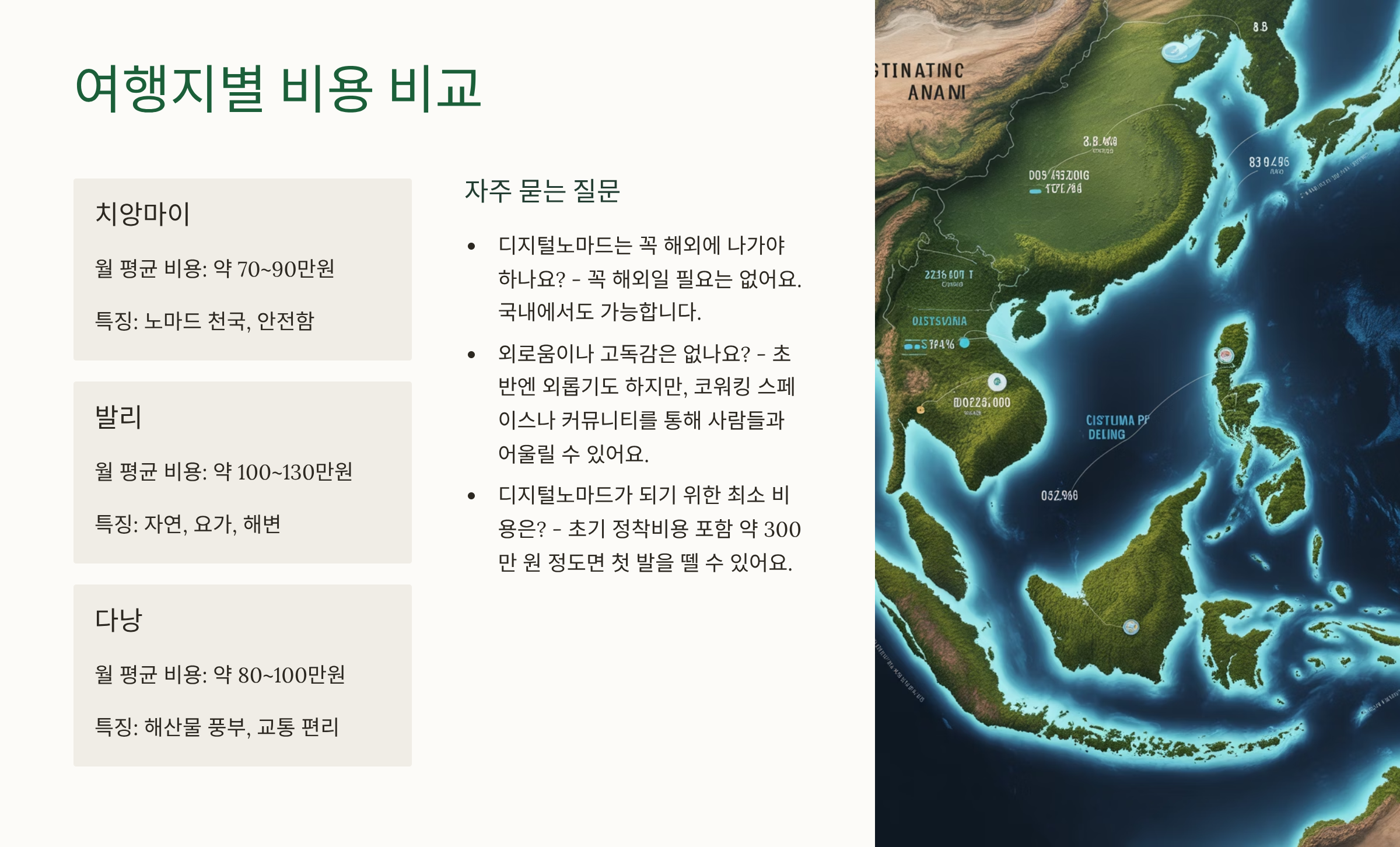 사실 디지털노마드 하면 다들 발리, 치앙마이 같은 곳을 떠올리잖아요? 이유가 있어요. 생활비가 저렴하면서 인터넷도 빠르고, 노마드 커뮤니티도 활성화되어 있거든요. 직접 비교해본 결과는 이렇습니다: