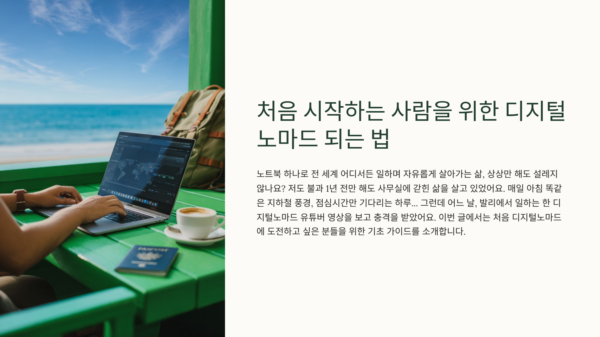 안녕하세요 여러분! 저도 불과 1년 전만 해도 사무실에 갇힌 삶을 살고 있었어요. 매일 아침 똑같은 지하철 풍경, 점심시간만 기다리는 하루, 퇴근 후엔 녹초가 되어 소파에 몸을 던지던 그 일상... 그게 전부인 줄 알았죠. 그런데 어느 날, 발리에서 일하는 한 디지털노마드 유튜버 영상을 보고 충격을 받았어요. ‘나도 저런 삶 살 수 있을까?’란 생각이 들더라구요. 그래서 하나하나 준비하며 지금의 자유로운 삶을 만들었답니다. 이번 글에서는 저처럼 처음 디지털노마드에 도전하고 싶은 분들을 위해, 아주 기초적인 단계부터 친절히 안내해드릴게요!