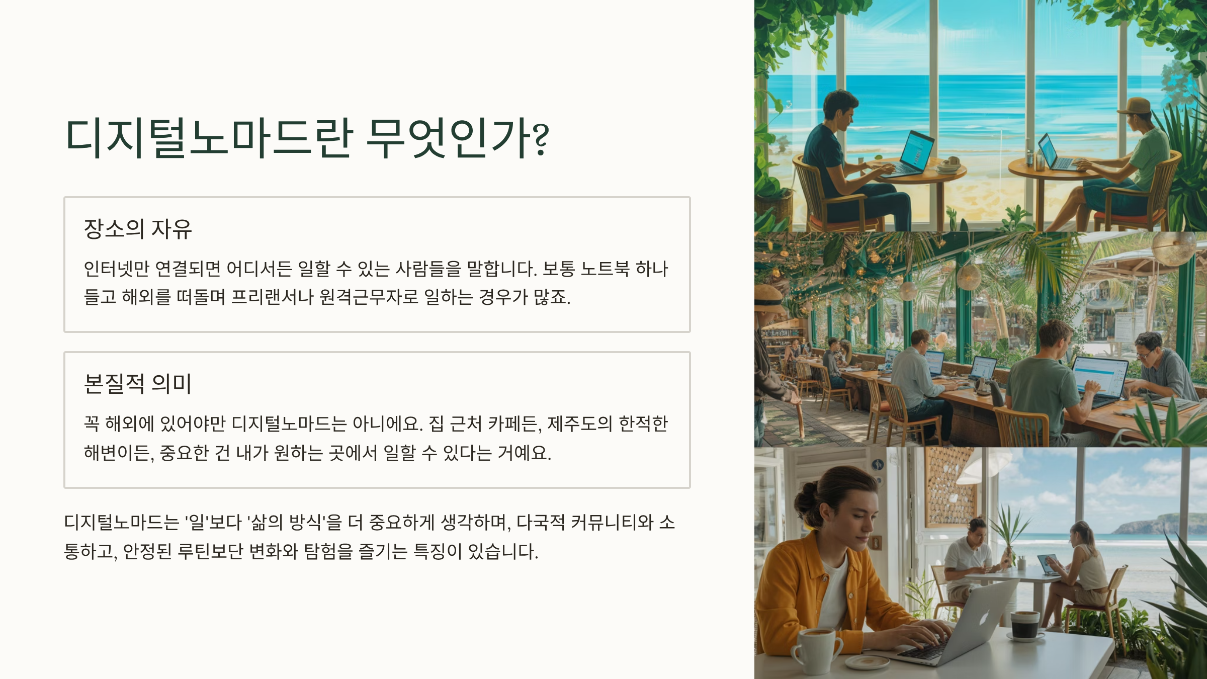 디지털노마드란 인터넷만 연결되면 어디서든 일할 수 있는 사람들을 말합니다. 보통 노트북 하나 들고 해외를 떠돌며 프리랜서나 원격근무자로 일하는 경우가 많죠. 하지만 꼭 해외에 있어야만 디지털노마드는 아니에요. 본질은 장소의 자유에 있습니다. 집 근처 카페든, 제주도의 한적한 해변이든, 중요한 건 내가 원하는 곳에서 일할 수 있다는 거예요.