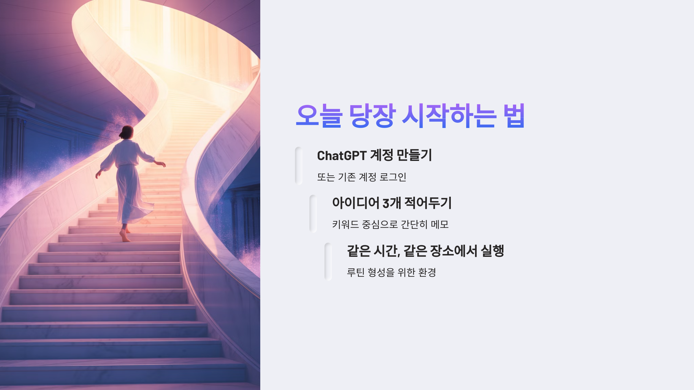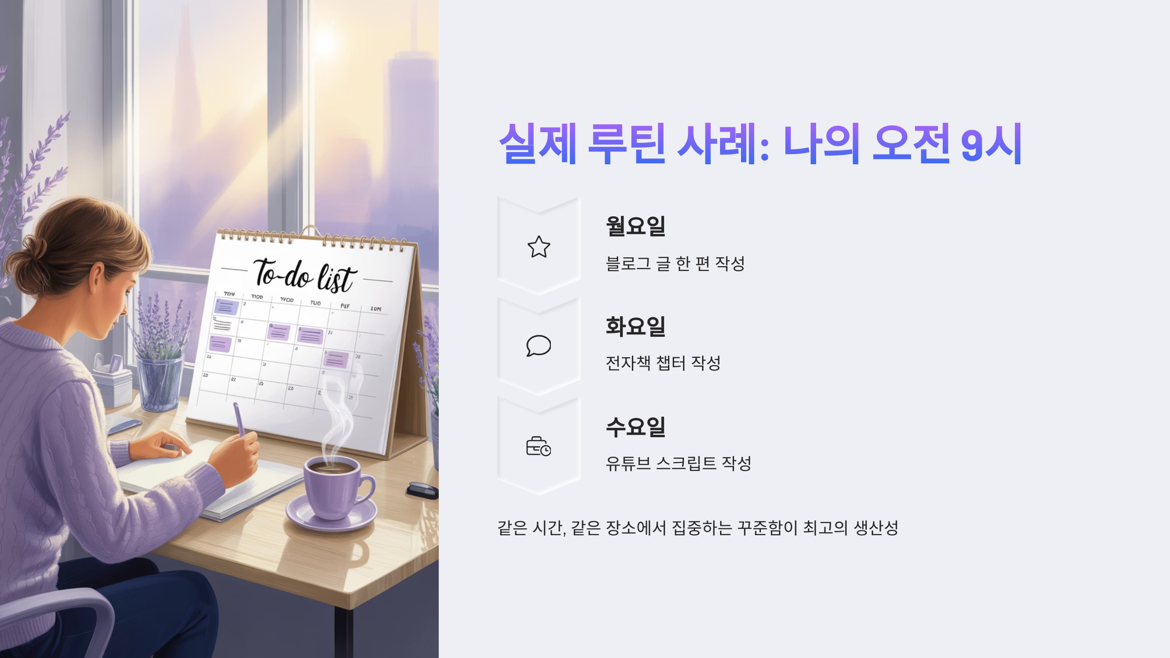 솔직히 말씀드리면 처음엔 아침 9시에 집중하는 게 쉽지 않았어요. 하지만 하루 1시간 루틴을 세우고, 정확히 그 시간만큼만 ChatGPT에 집중했더니 오히려 더 많은 결과물이 나왔어요. 월요일엔 블로그 글 한 편, 화요일엔 전자책 챕터 작성, 수요일엔 유튜브 스크립트... 이렇게 요일별로 주제를 정했죠. 매일 똑같은 시간, 똑같은 장소에서 집중하니 루틴이 몸에 배더라고요. 꾸준함이 최고의 생산성 툴이라는 걸 느꼈어요.
