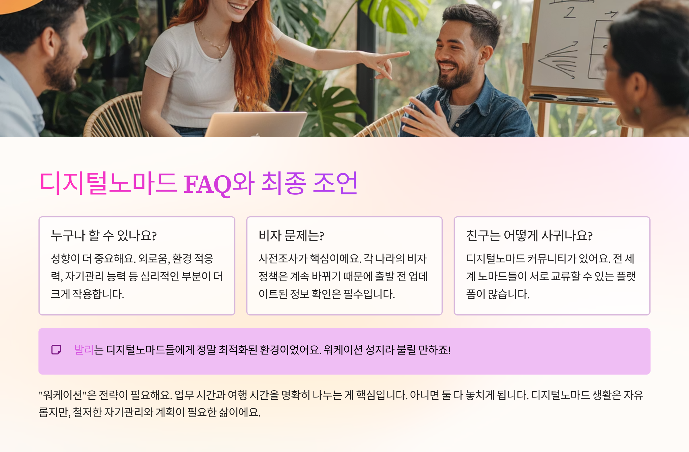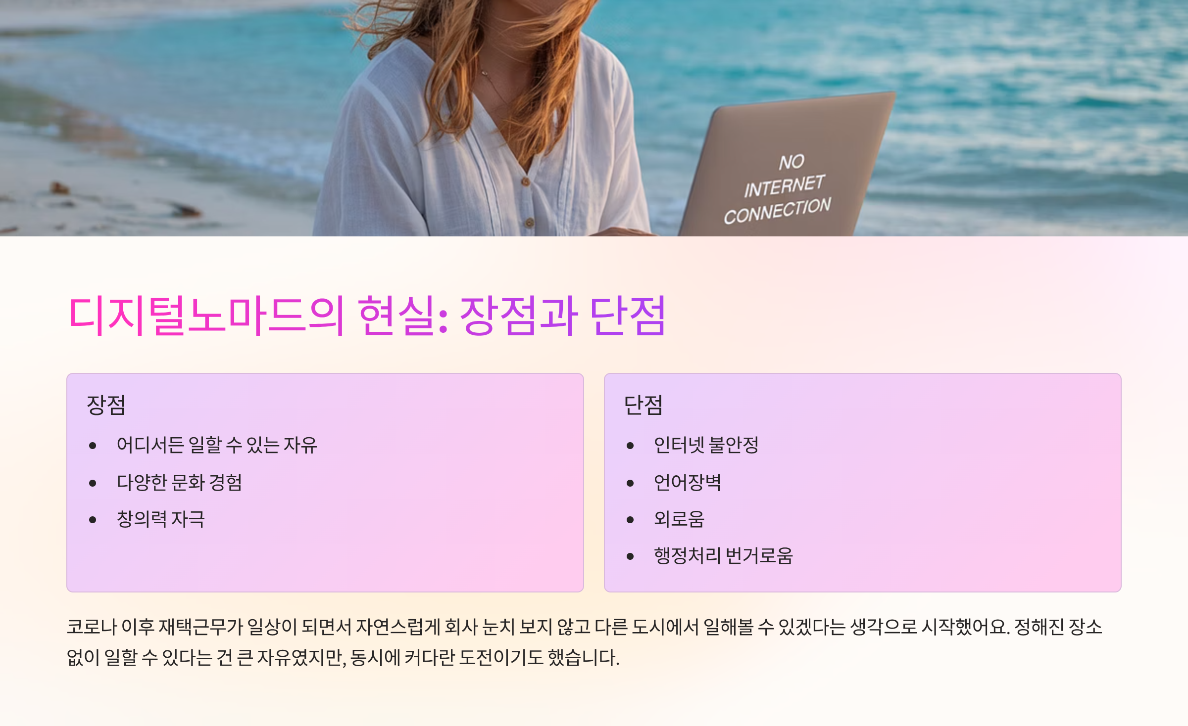 - 장점: 어디서든 일할 수 있는 자유, 다양한 문화 경험, 창의력 자극