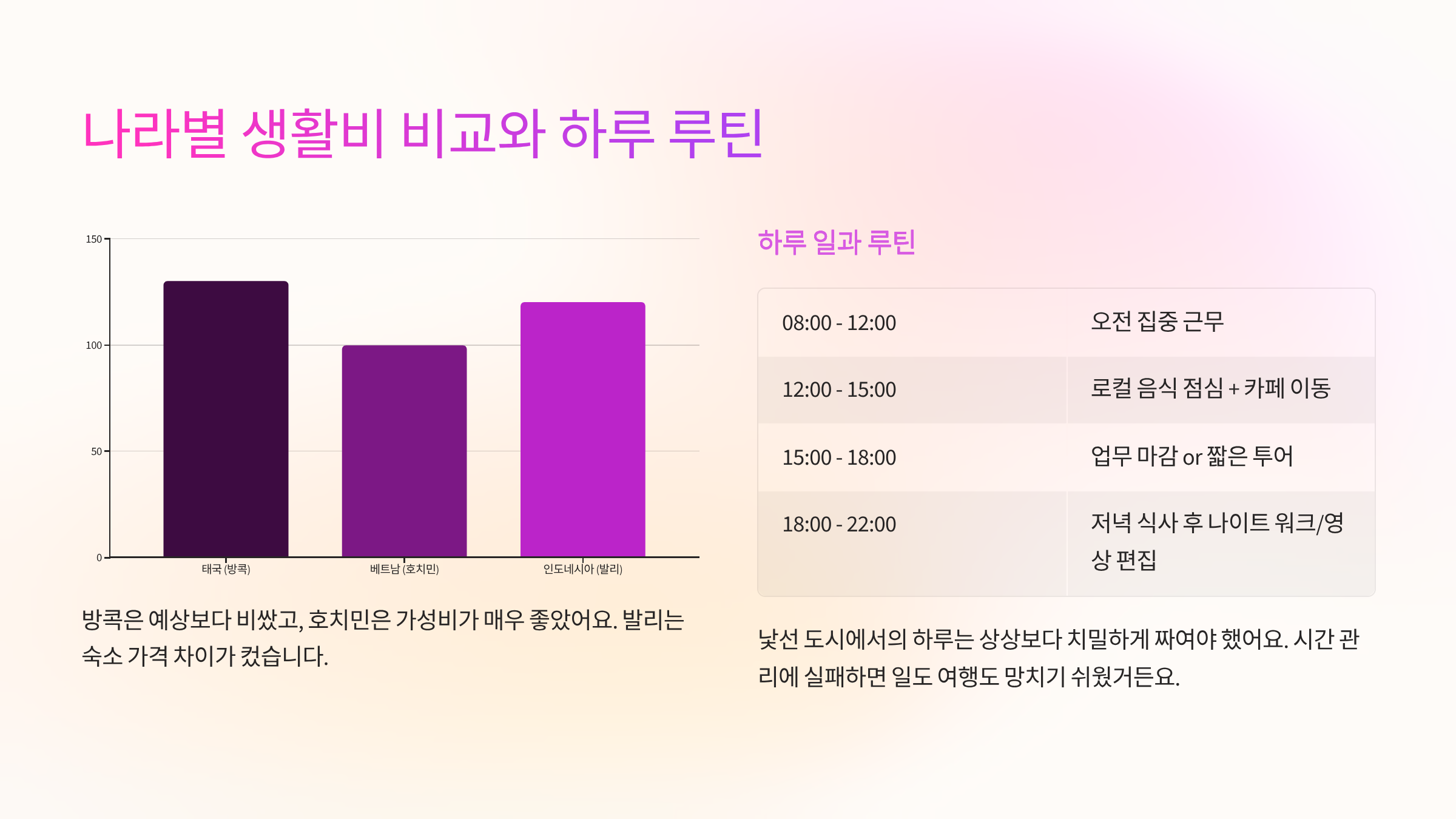 디지털노마드가 되는 데 있어 가장 현실적인 문제는 역시 '돈'입니다. 저는 태국, 베트남, 인도네시아 3개국을 돌았는데요, 나라마다 물가 차이가 꽤 컸어요. 특히 방콕은 예상보다 비쌌고, 호치민은 가성비가 매우 좋았죠. 한 달 예산은 주거, 식사, 교통, 카페 이용 등을 기준으로 다음과 같았어요.