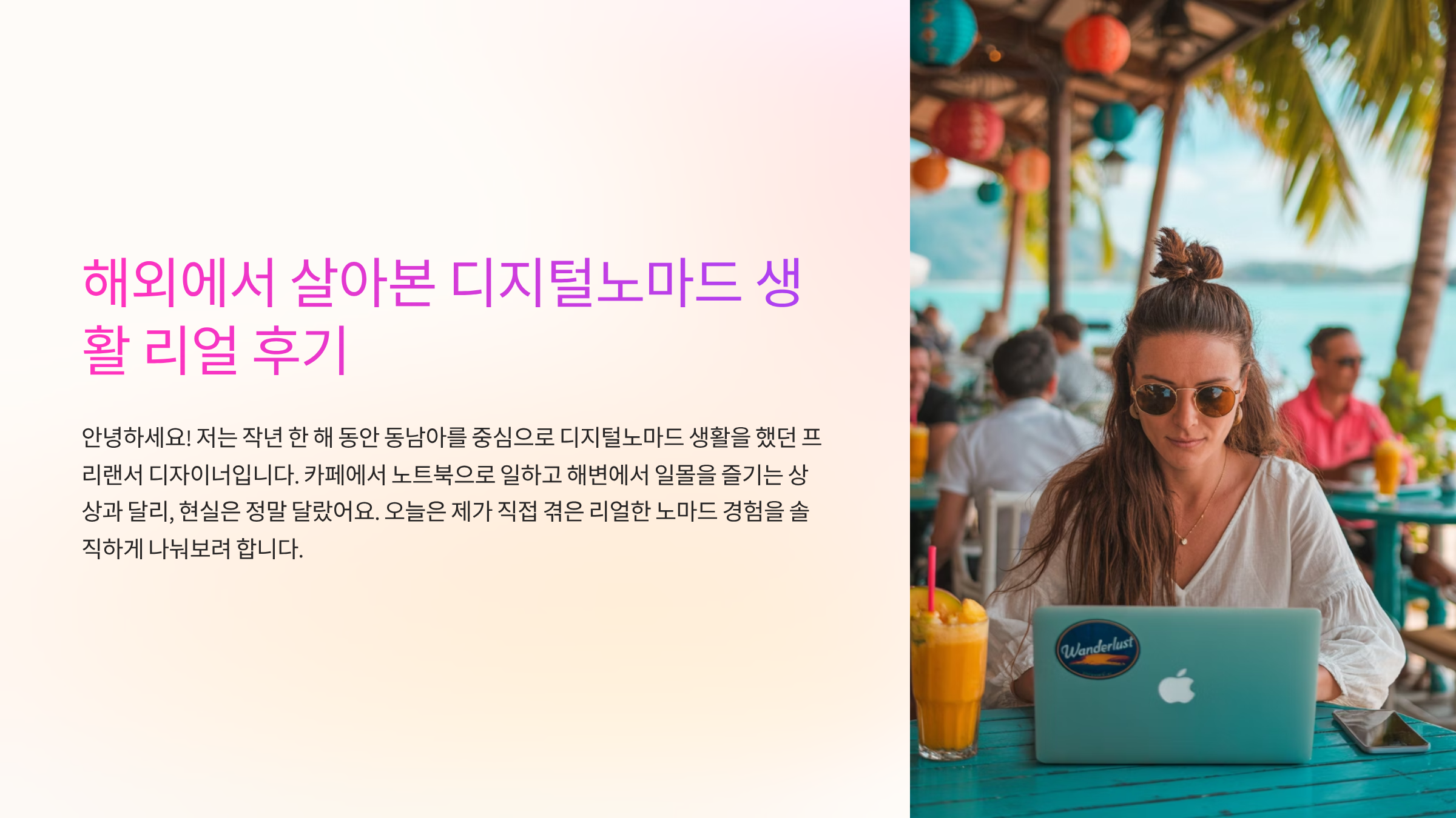 안녕하세요 여러분! 저는 작년 한 해 동안 동남아를 중심으로 디지털노마드 생활을 했던 경험을 가진 프리랜서 디자이너입니다. 처음엔 카페에서 노트북 하나로 일하고, 해변에서 일몰을 즐기는 상상만 했는데요. 막상 부딪혀보니 현실은 상상과는 정말 달랐어요. 오늘은 제가 직접 겪은 리얼한 노마드 경험을 여러분과 솔직하게 나눠보려 해요. 혹시나 비슷한 삶을 꿈꾸고 계신 분들에게 작게나마 도움이 되었으면 좋겠어요.