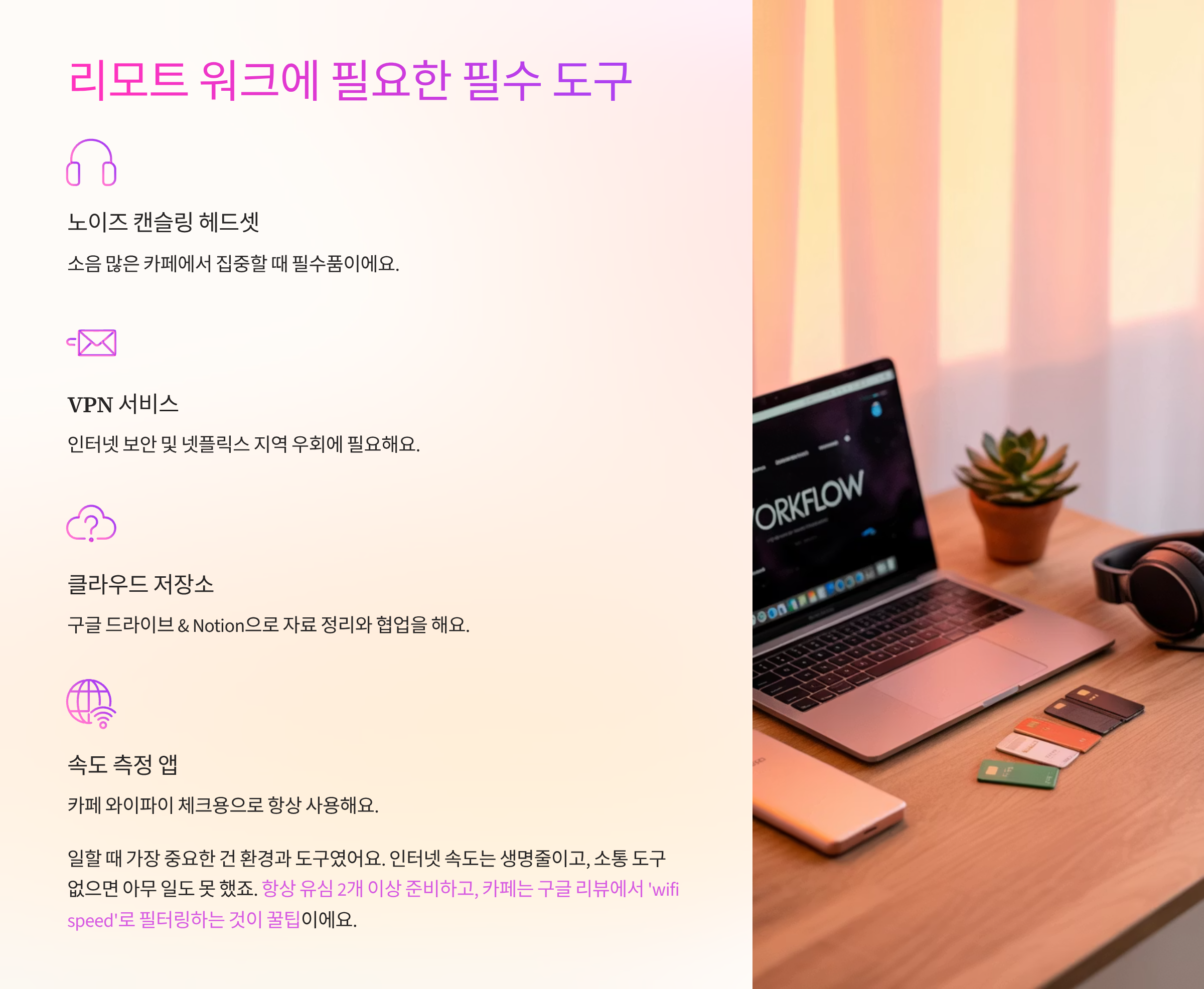 일할 때 가장 중요한 건 환경과 도구였어요. 인터넷 속도는 생명줄이고, 소통 도구 없으면 아무 일도 못 하죠. 제가 꼭 챙겨 다녔던 도구들을 소개할게요.