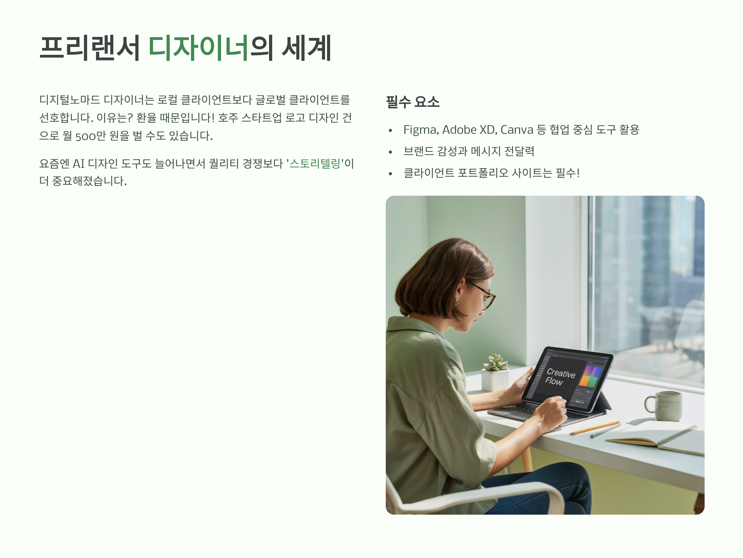 디지털노마드 디자이너는 로컬 클라이언트보다 글로벌 클라이언트를 선호해요. 이유요? 환율이죠! 저는 한때 호주 스타트업 로고 디자인 건으로 월 500만 원을 벌었던 적도 있어요. 요즘엔 AI 디자인 도구도 늘어나면서 퀄리티 경쟁보다 ‘스토리텔링’이 더 중요해졌답니다.