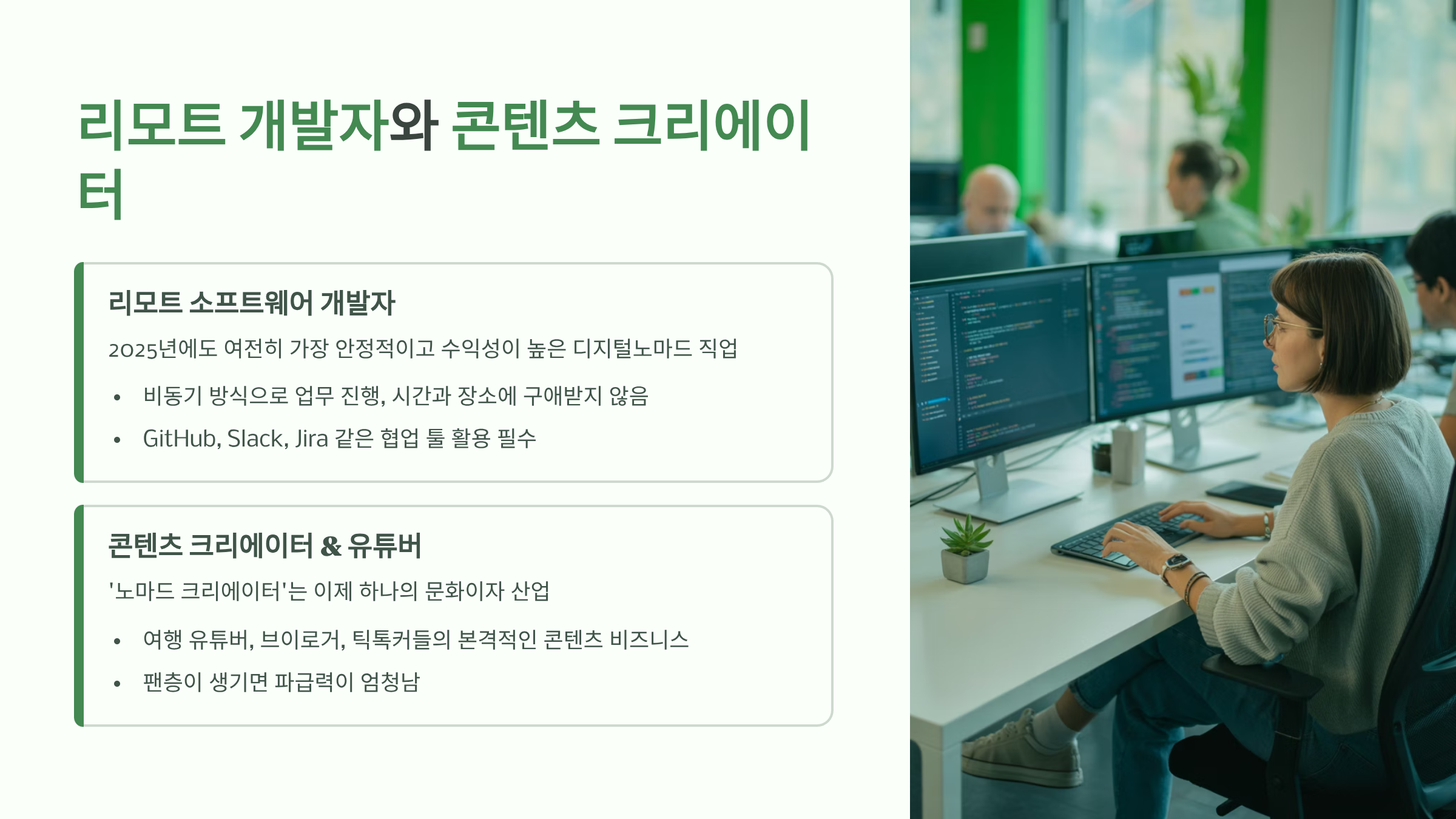 2025년에도 여전히 가장 안정적이고 수익성이 높은 디지털노마드 직업 중 하나는 바로 ‘리모트 개발자’예요. 클라이언트와의 실시간 커뮤니케이션이 필수적이긴 하지만, 대부분 비동기 방식으로 업무가 진행돼 시간과 장소에 구애받지 않는다는 점이 큰 장점이죠. 저는 한때 동유럽에서 일주일 동안 로밍 데이터만으로 미국 스타트업 프로젝트를 맡았던 기억이 있어요. 전 세계 개발자들이 협업하는 GitHub, Slack, Jira 같은 툴은 말 그대로 생명줄이에요!