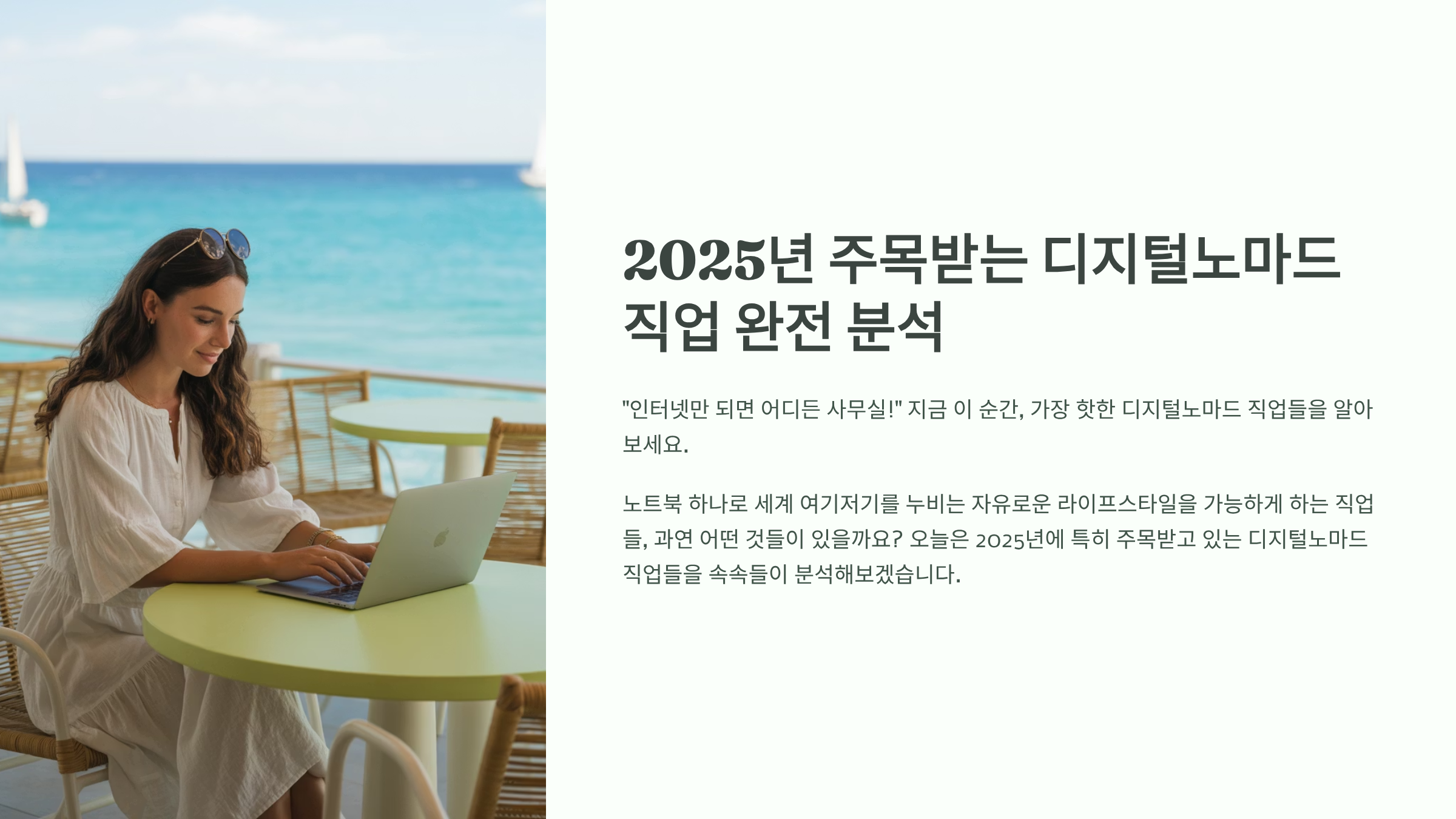 안녕하세요 여러분 :) 요즘 ‘디지털노마드’라는 말, 정말 많이 들리죠? 저도 작년부터 이 세계에 발을 담그기 시작하면서 노트북 하나로 세계 여기저기를 누비는 삶에 푹 빠졌답니다. 맑은 날엔 제주 협재 해변 카페에서 일하고, 비 오는 날엔 창밖으로 떨어지는 빗소리 들으며 서울 홍대의 코워킹스페이스에서 글을 써요. 정말이지, 한 번 빠지면 헤어나오기 힘든 매력이 있어요. 그런데 말이에요, 이 자유롭고 유연한 라이프스타일을 가능하게 하는 직업들, 과연 어떤 것들이 있을까요? 오늘은 2025년에 특히 주목받고 있는 디지털노마드 직업들을 속속들이 분석해보려 해요!