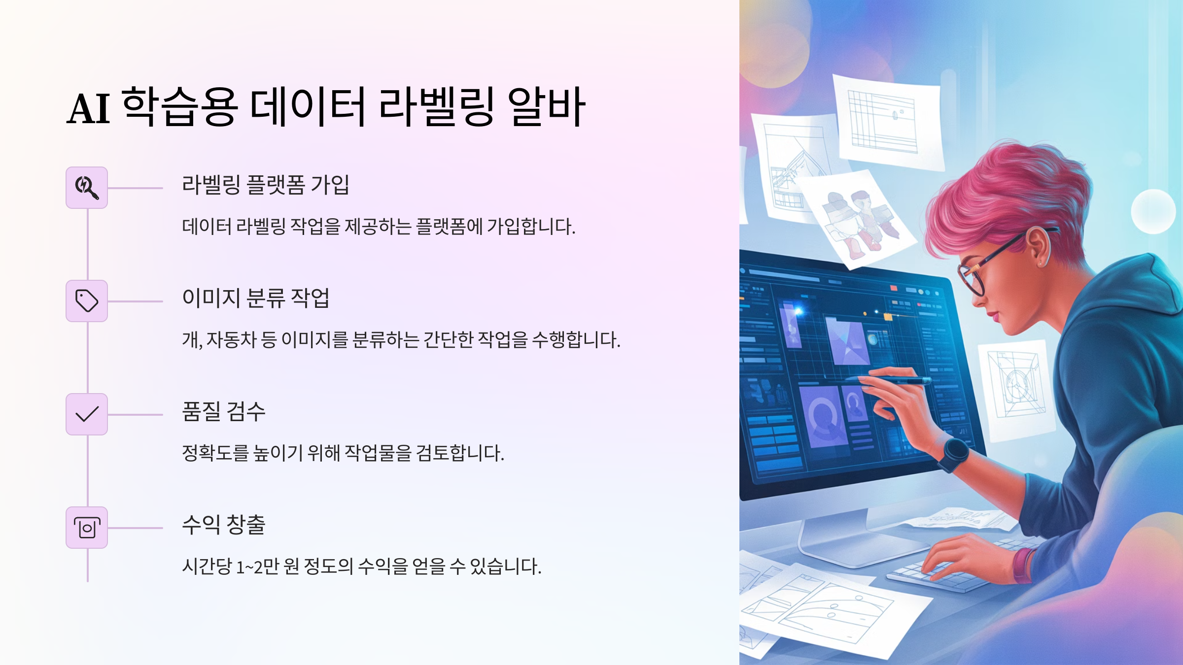 전문 지식 없어도 가능한 AI 관련 부업, 바로 데이터 라벨링입니다. 이미지는 이건 개, 저건 자동차 이렇게 분류하는 작업이에요. 클릭 몇 번으로 시간당 1~2만 원 정도 벌 수 있어서, 부업으로 딱이에요.