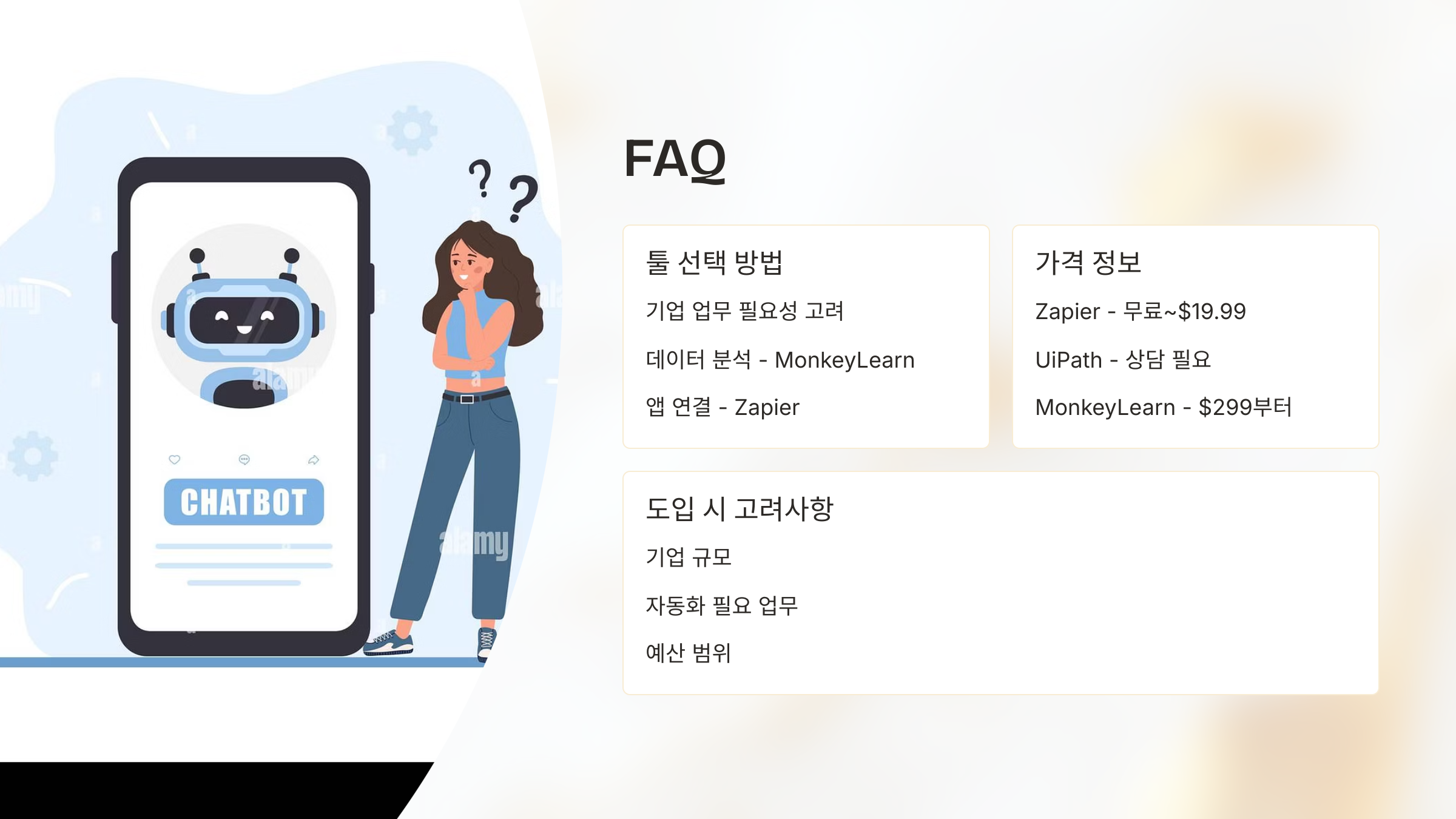 AI 자동화 툴은 기업의 효율성을 크게 개선할 수 있는 강력한 도구입니다. 하지만 각 툴이 제공하는 기능과 특성에 따라 적합한 툴을 선택하는 것이 중요합니다. 다음과 같은 툴들을 추천드립니다: