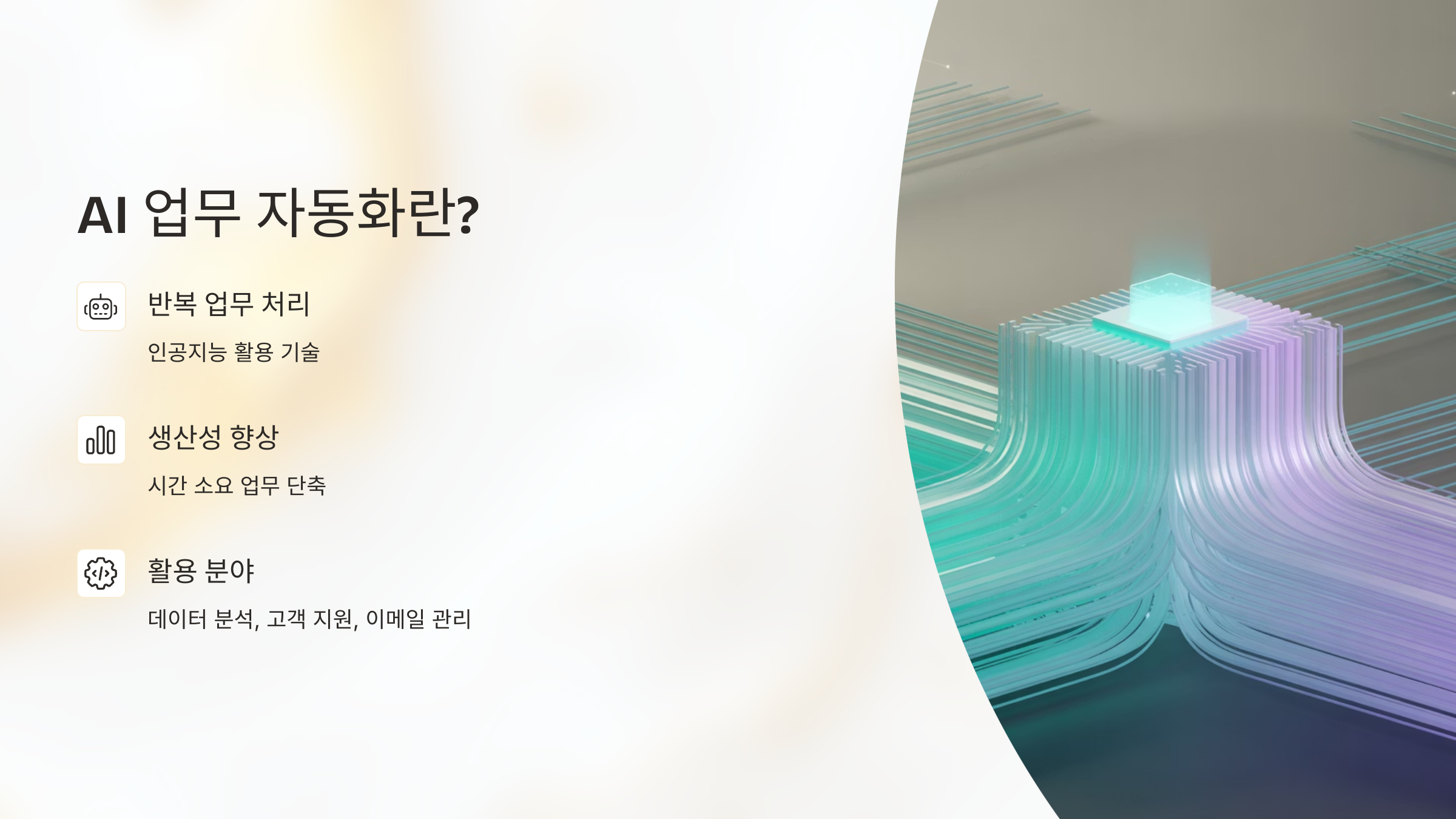 AI 업무 자동화는 기업이 반복적인 업무를 효율적으로 처리하기 위해 인공지능을 활용하는 기술입니다. 이 기술은 기업의 생산성을 크게 향상시킬 수 있으며, 시간이 많이 소요되는 업무를 단축시킬 수 있는 장점이 있습니다. 예를 들어, 데이터 분석, 고객 지원, 이메일 관리 등의 반복적인 작업을 AI가 자동으로 처리할 수 있습니다.