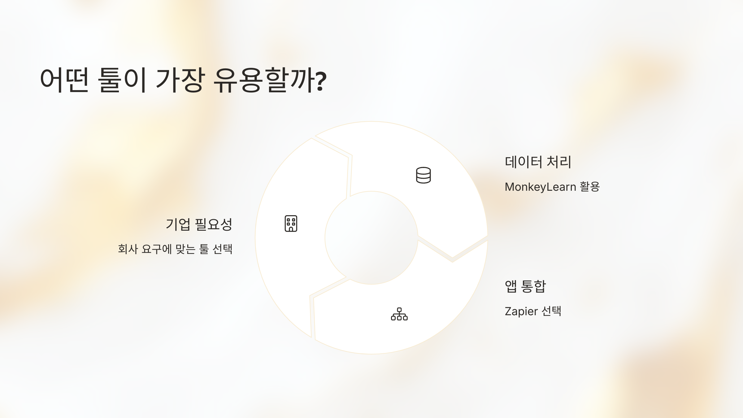 AI 업무 자동화 툴을 선택할 때는 기업의 업무 필요성에 맞는 툴을 선택하는 것이 중요합니다. 예를 들어, 데이터 분석이 필요한 경우 MonkeyLearn을, 여러 앱을 연결해야 하는 경우 Zapier를 고려할 수 있습니다.