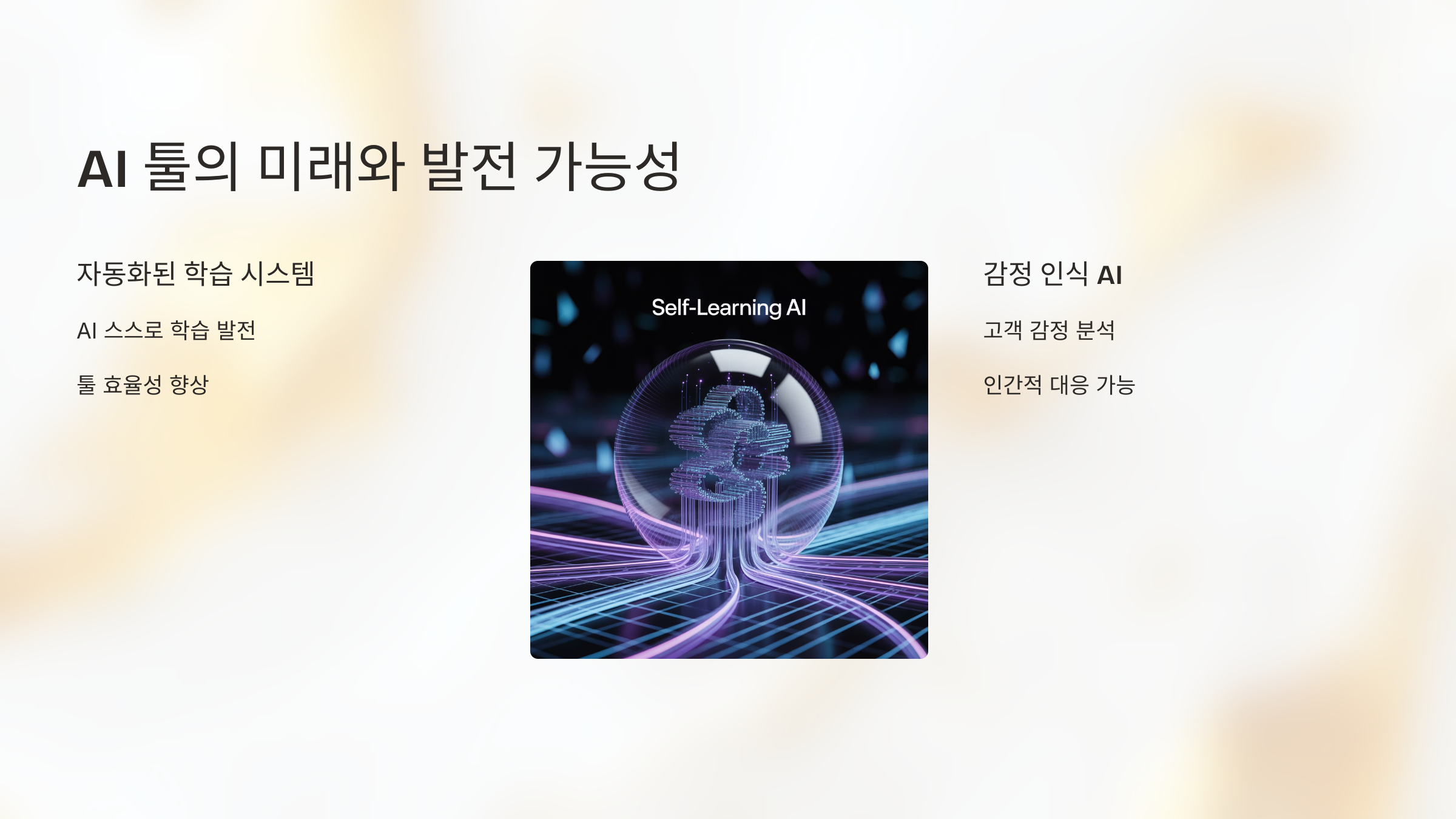 | 자동화된 학습 시스템 | AI가 스스로 학습하고 발전하는 시스템으로, 툴의 효율성을 더욱 향상시킬 것입니다. |