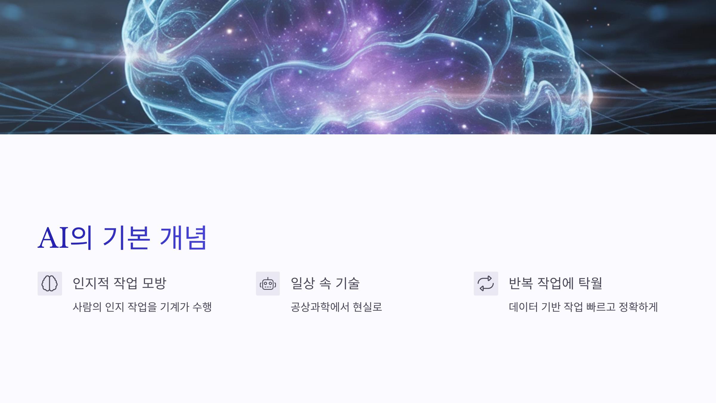 AI, 즉 인공지능은 사람이 수행하는 인지적 작업을 기계가 모방할 수 있도록 만든 기술입니다. 예전에는 공상과학 영화 속에서나 볼 수 있던 기술이 이제는 우리 일상과 업무에 깊숙이 들어와 있어요. 특히 반복적이거나 데이터 기반의 작업을 빠르고 정확하게 처리하는 데 탁월하죠. 초보자라면 ‘기계가 나 대신 일해주는 기술’로 이해하셔도 충분합니다.