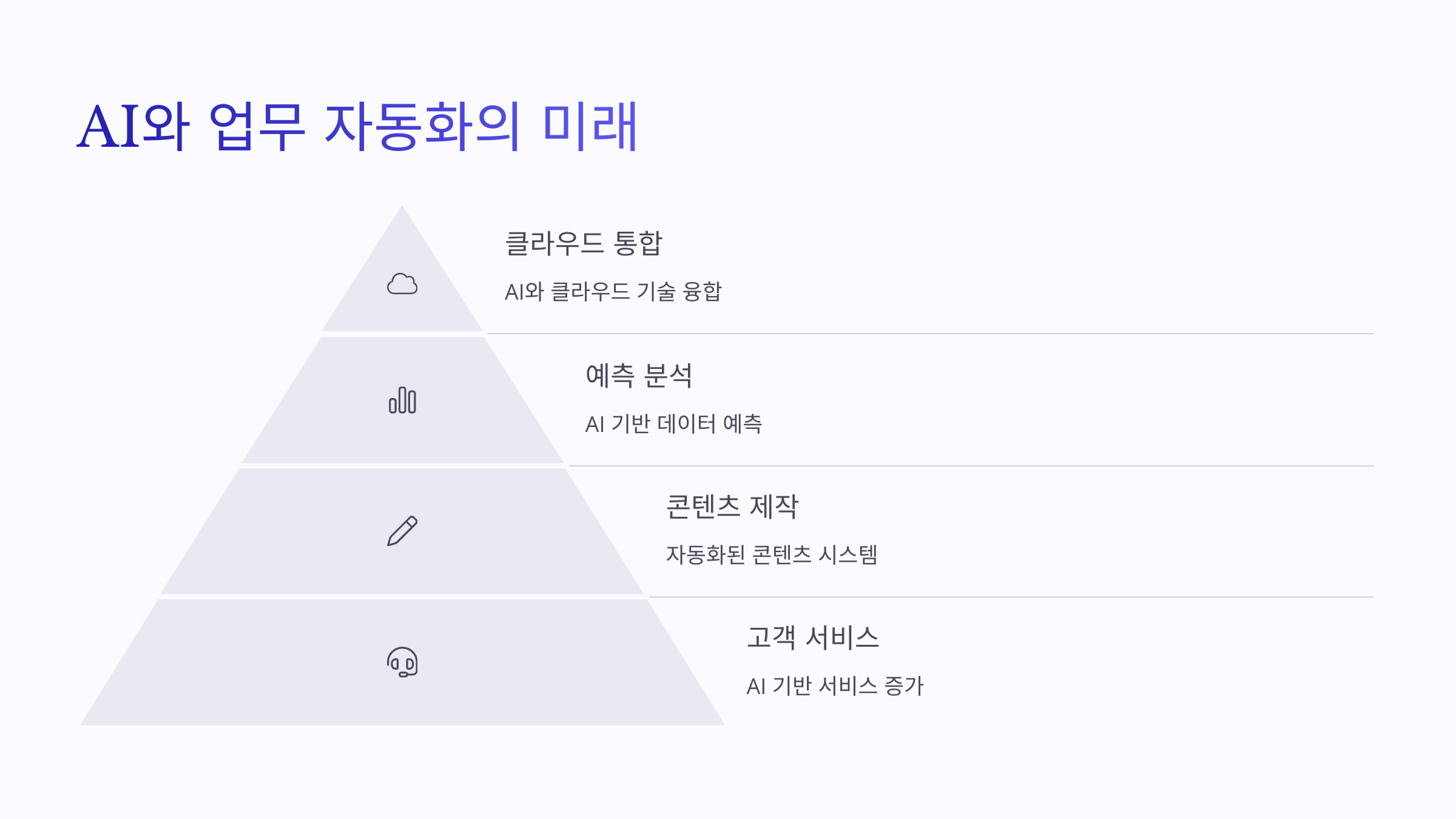 AI 기술은 빠르게 발전하고 있으며, 그에 따라 업무 자동화도 점점 더 효율적이고 정교해지고 있습니다. 가까운 미래에는 다양한 분야에서 AI가 인간의 업무를 대체하는 모습이 더 많이 볼 수 있을 것입니다. 예를 들어, 고객 서비스, 데이터 분석, 콘텐츠 생성 등에서 AI가 중추적인 역할을 할 가능성이 높습니다.