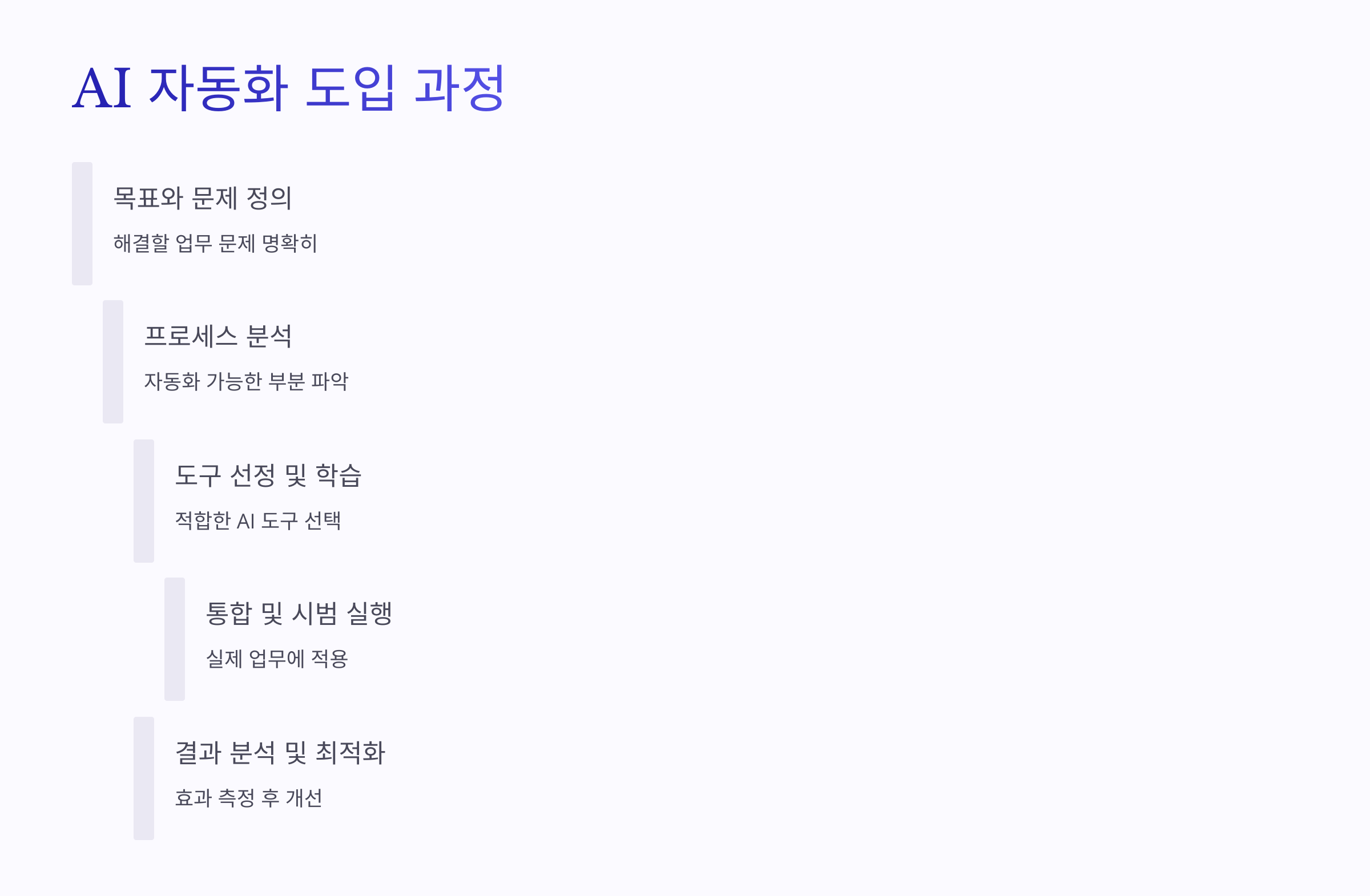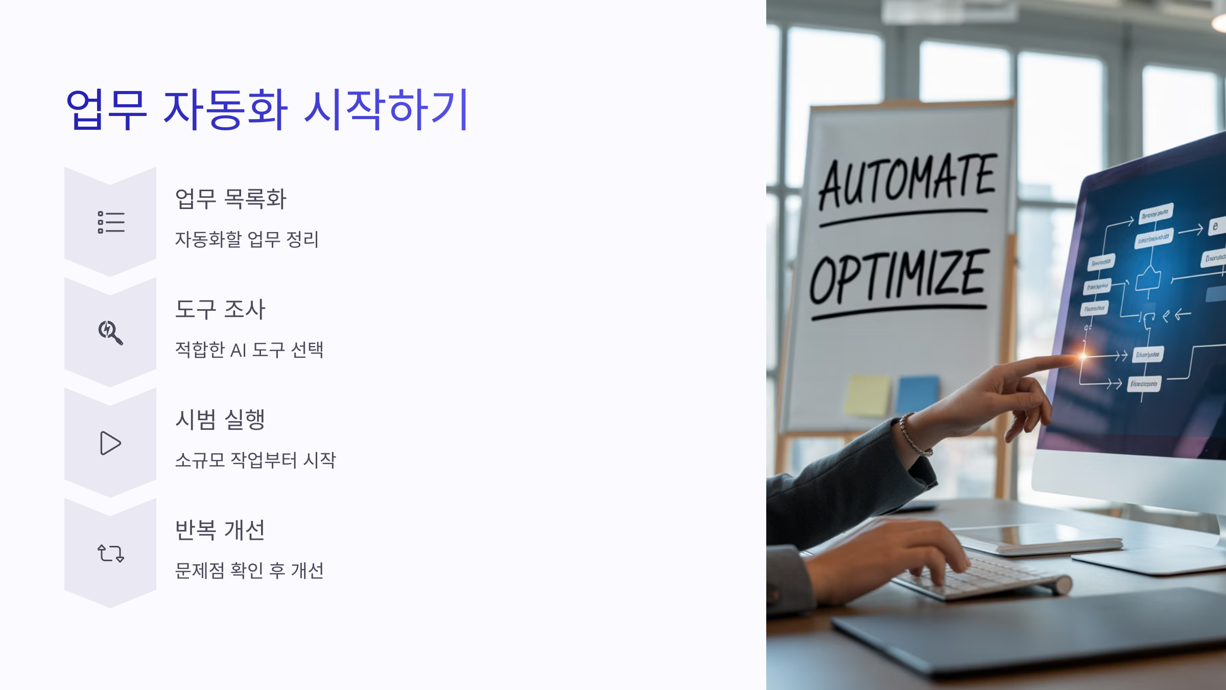 AI 자동화를 도입하는 과정은 몇 가지 중요한 단계로 나눠집니다. 각각의 단계를 차근차근 진행하면서 업무에 적합한 방법을 찾아가세요.