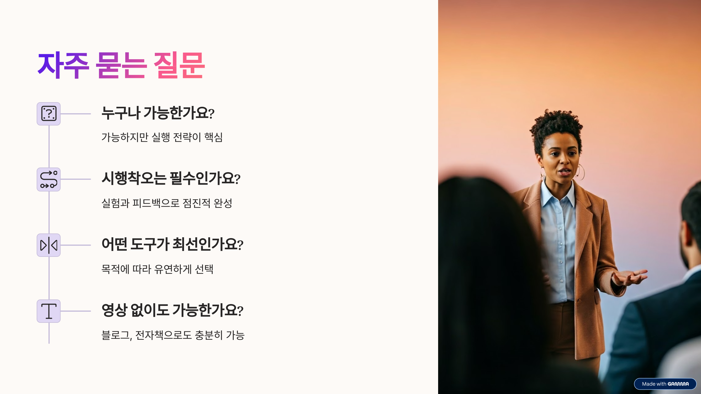 솔직히 말하자면, 대부분의 사람들이 AI로 수익을 내지 못하는 이유는 ‘기술’ 때문이 아니에요. 마인드셋이 안 되어 있어서 그렇습니다. 수익화를 제대로 하기 위해선 ‘일단 시작해보자’가 아니라, ‘어떻게 하면 지속가능한 구조를 만들까’를 고민해야 해요. 단기 수익에만 집중하는 태도는 오히려 발목을 잡습니다. 저는 매일 스스로에게 물어봐요. “이건 단발성인가, 시스템인가?” 이 질문 하나가 수익화의 판도를 바꿨습니다.