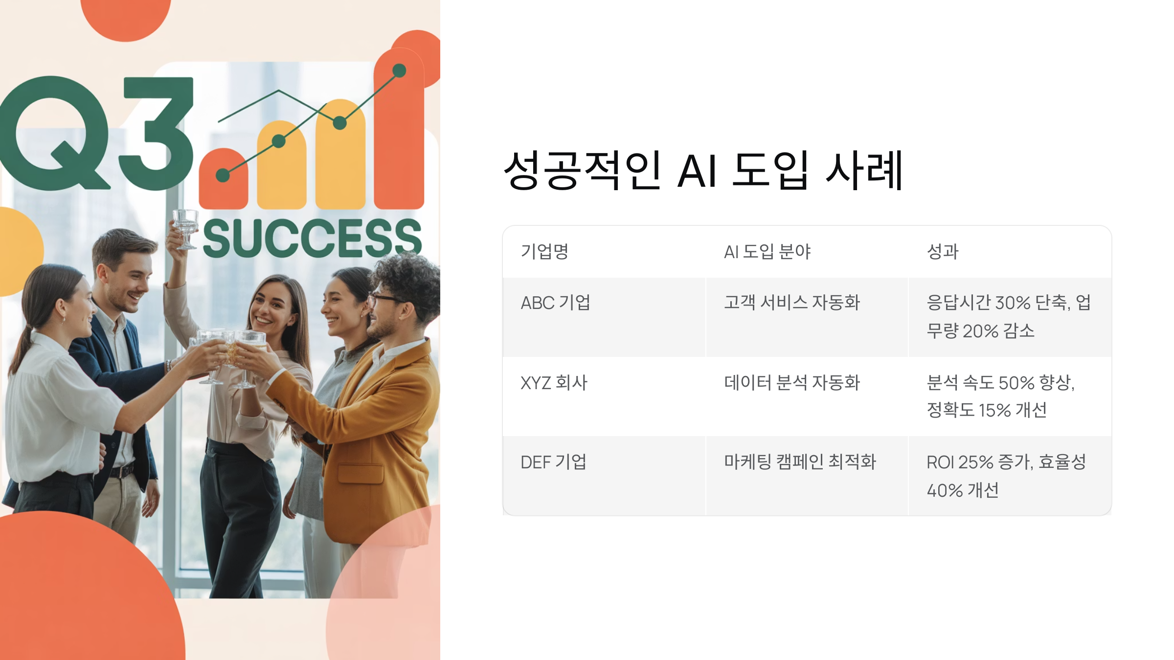 | ABC 기업 | 고객 서비스 자동화 | 고객 응답 시간 30% 단축, 직원 업무량 20% 감소 |