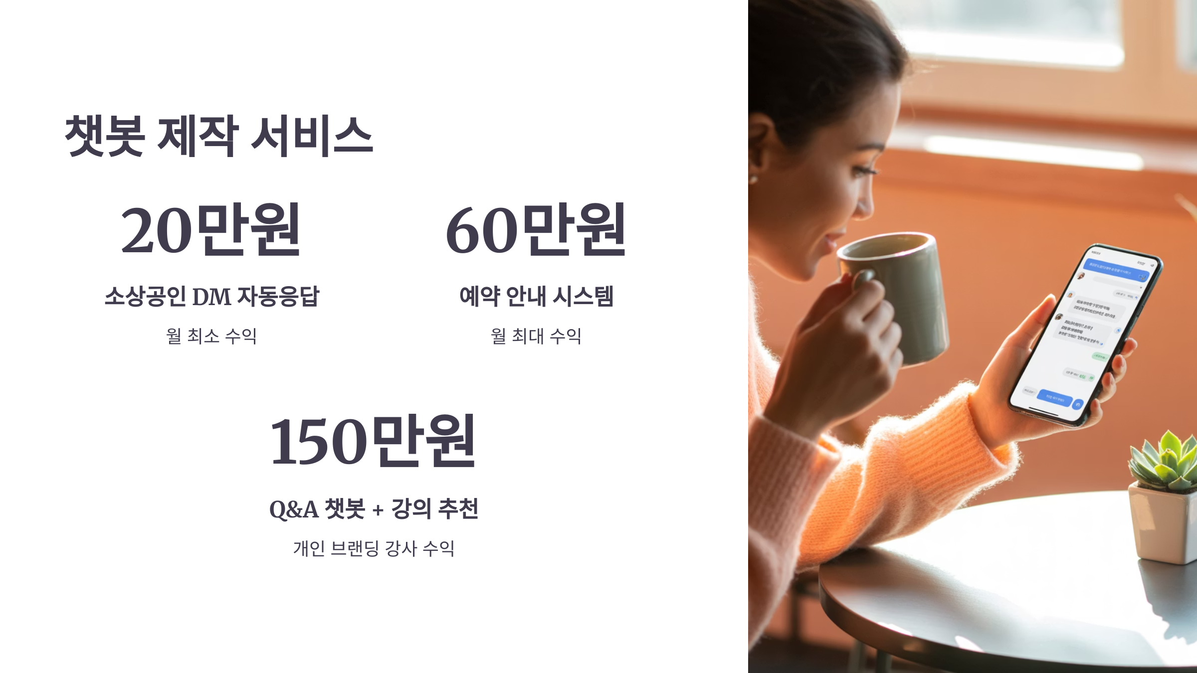 요즘 많은 회사나 개인 브랜드들이 "고객 응대 자동화"에 관심을 갖고 있어요. ChatGPT API를 활용해 챗봇을 제작해 주는 서비스는 아직도 블루오션입니다. 실제 수익 구조를 표로 정리해보면 아래와 같습니다.