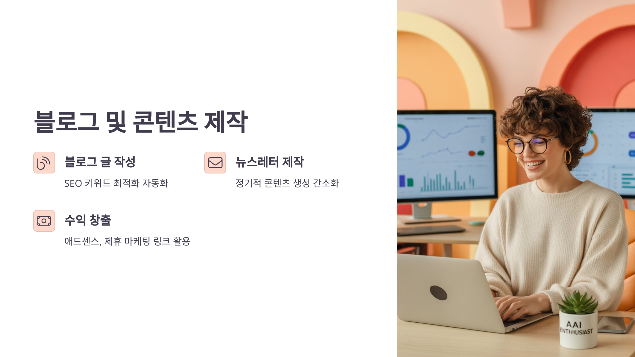 ChatGPT를 이용해 블로그 글, 뉴스레터, SNS 콘텐츠까지 작성하는 사람들 많습니다. 단순히 글 쓰는 시간을 줄여주는 수준이 아니라, SEO 키워드 최적화까지 자동으로 해주는 기능 덕분에 수익형 블로그 운영이 쉬워졌죠. 특히 애드센스 광고 수익이나 제휴 마케팅 링크를 삽입하면 별다른 제품 없이도 수익 창출이 가능합니다.