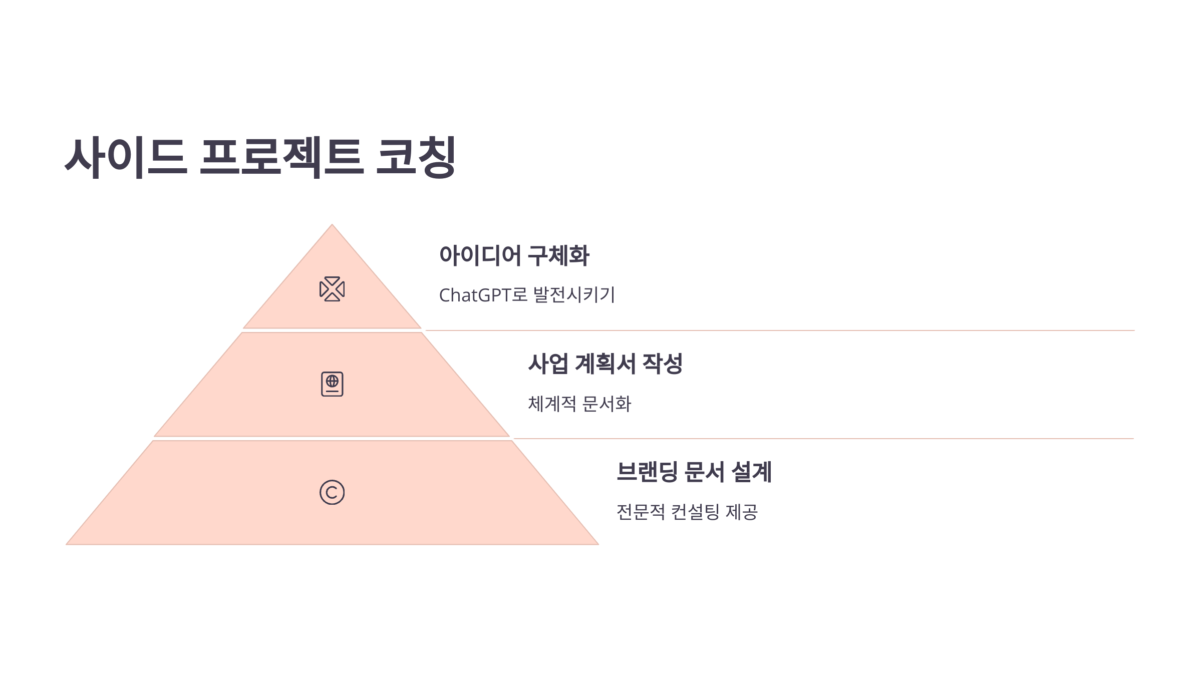 전문가가 아니어도 괜찮아요. ChatGPT를 도구 삼아, 사이드 프로젝트를 기획하고 정리해 주는 역할만으로도 컨설팅이 가능합니다. 특히 아이디어 구체화, 사업 계획서 작성, 브랜딩 문서 설계에 ChatGPT가 강력한 지원군이 되죠. 그걸 기반으로 슬랙 커뮤니티 운영이나 코칭 프로그램으로 확장할 수 있어요.