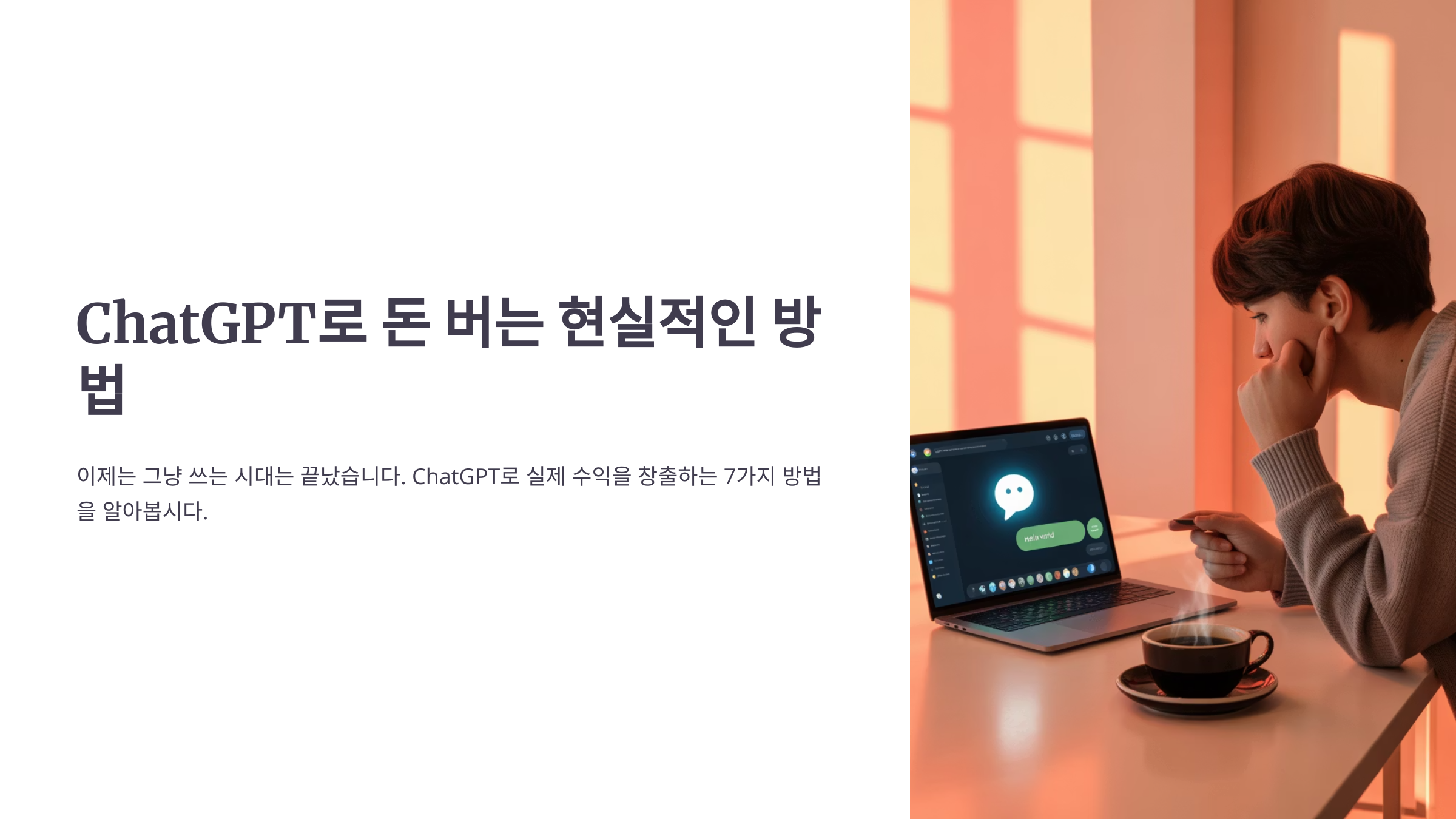 안녕하세요, 요즘 부쩍 ChatGPT 얘기 많이 들으시죠? 저도 처음엔 단순한 채팅 도구 정도로 생각했는데요, 어느 순간부터 제 수입의 한 축이 돼버렸어요. 이 글에서는 제가 직접 시도해 보고, 주변에서 실제로 돈을 벌고 있는 사례들을 모아봤어요. 허황된 이야기 대신, 누구나 시작할 수 있는 현실적인 방법만 정리해 드릴게요. 커피 한 잔 하면서 편하게 읽어주세요.