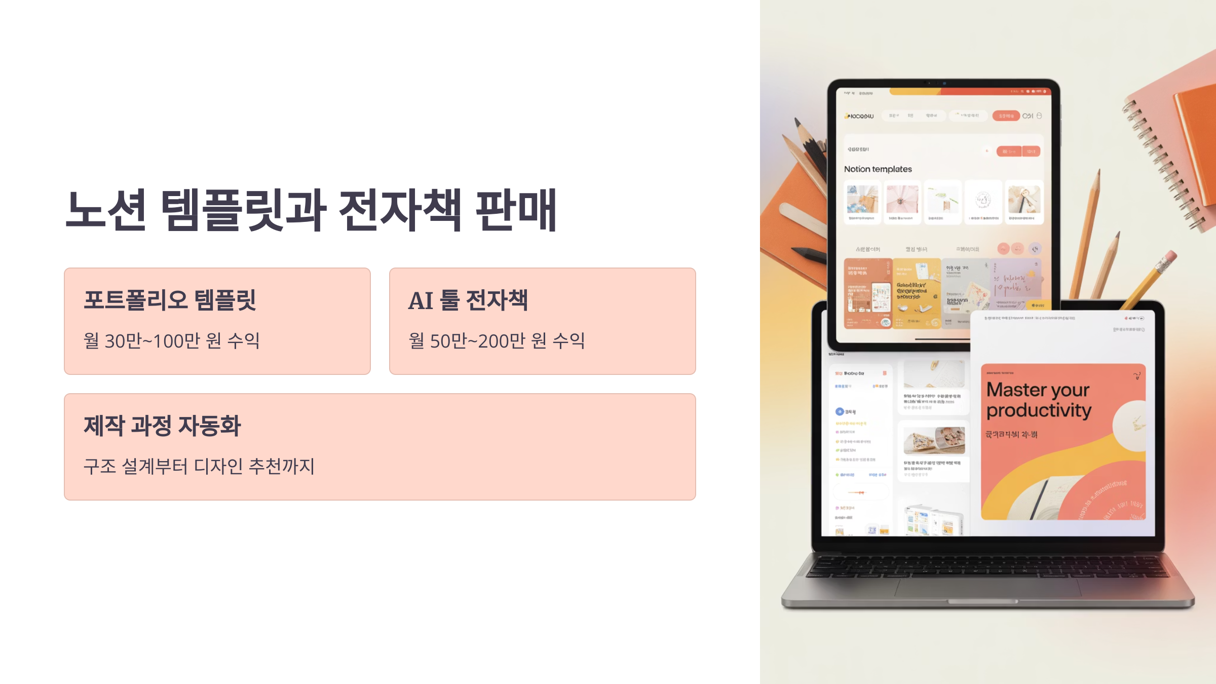 콘텐츠 작성에 특화된 ChatGPT를 활용하면 노션 템플릿이나 전자책도 쉽게 만듭니다. 정보 구조 설계부터 글쓰기, 디자인 추천까지 한 번에 해결할 수 있죠. 아래는 실제 수익 구조 예시입니다.