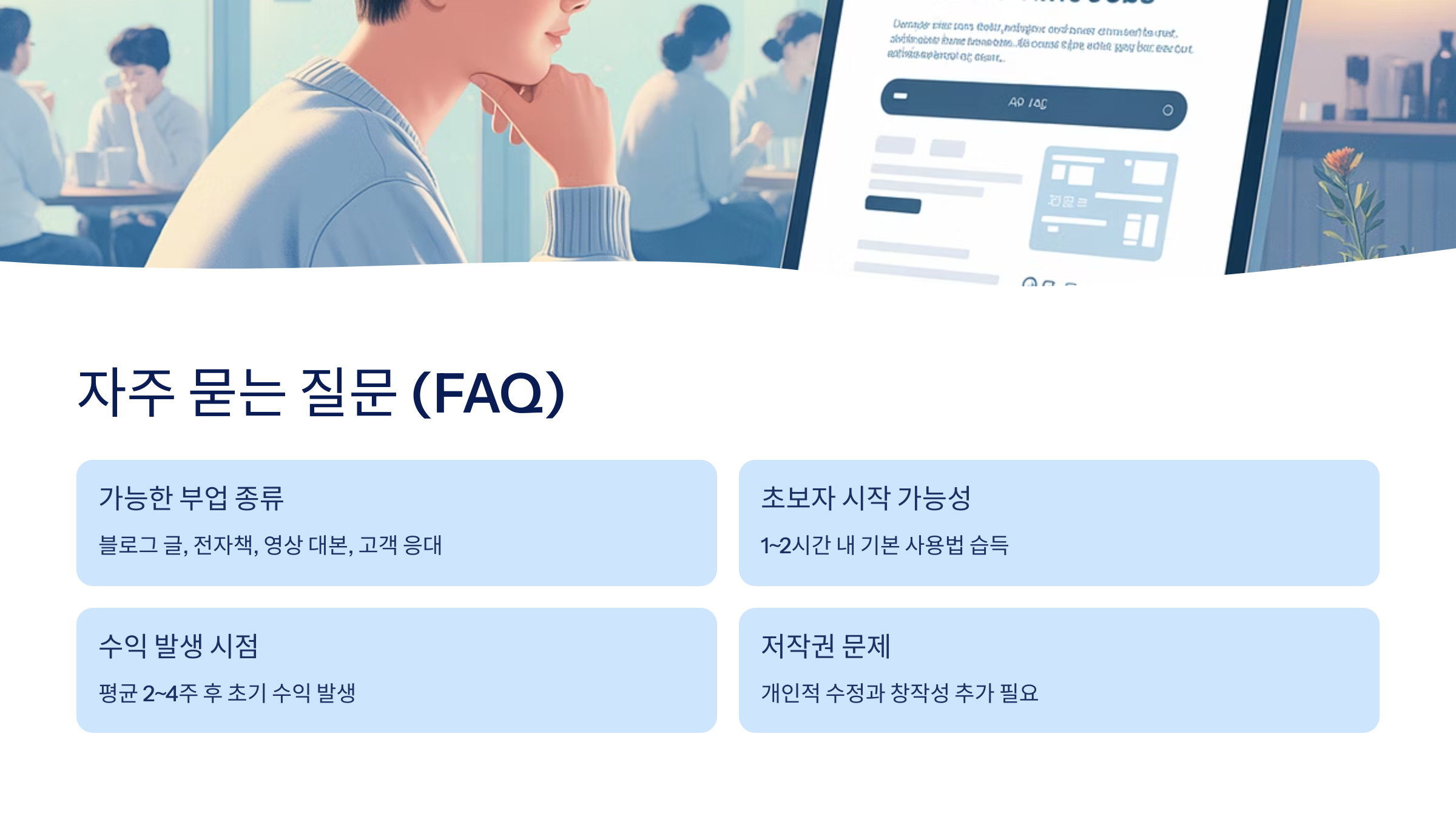 블로그 글 작성, 전자책 집필, 영상 대본 제작, 자동화된 고객 응대 등이 대표적인 부업 형태입니다.