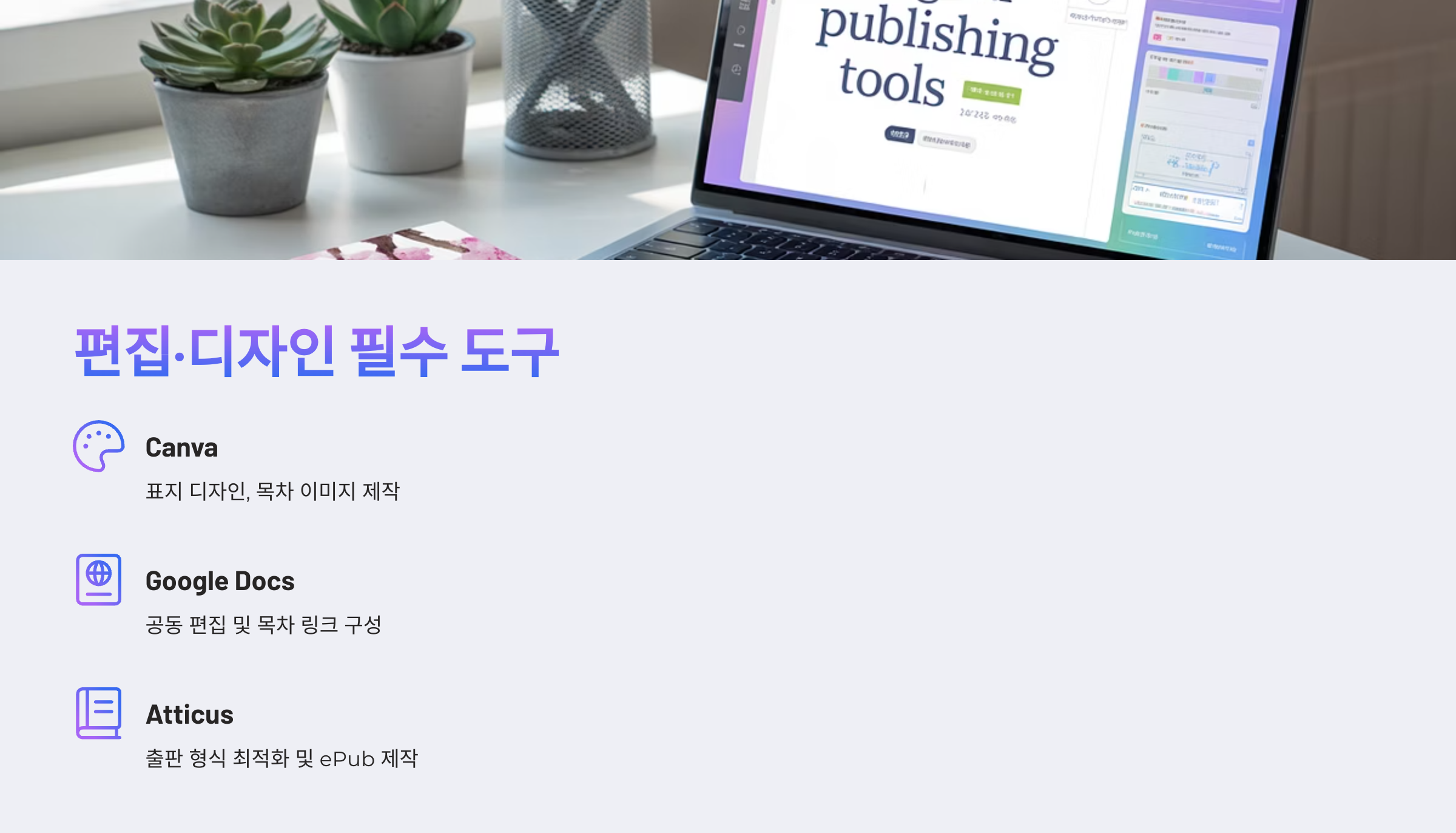 책이라는 건 내용도 중요하지만, 첫인상도 엄청 중요하죠. 제목, 표지, 레이아웃이 엉성하면 아무리 내용이 좋아도 신뢰를 잃어요. 그래서 저는 아래의 툴들을 적극적으로 활용하고 있습니다.